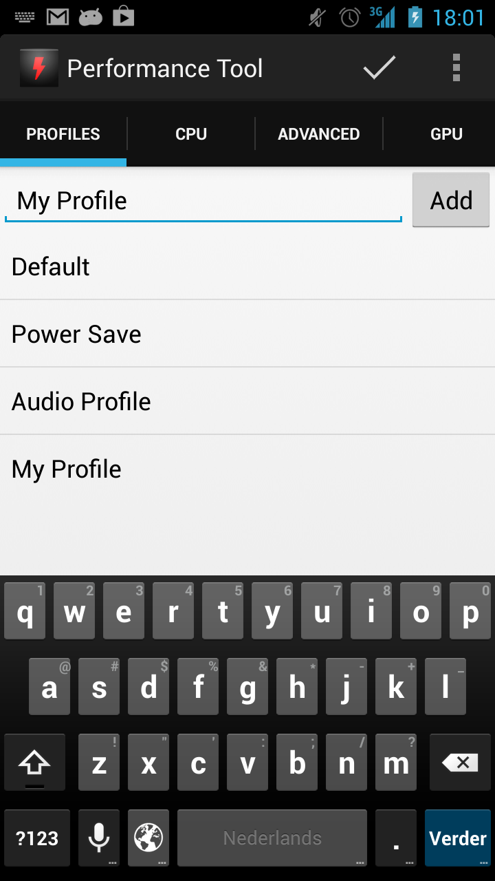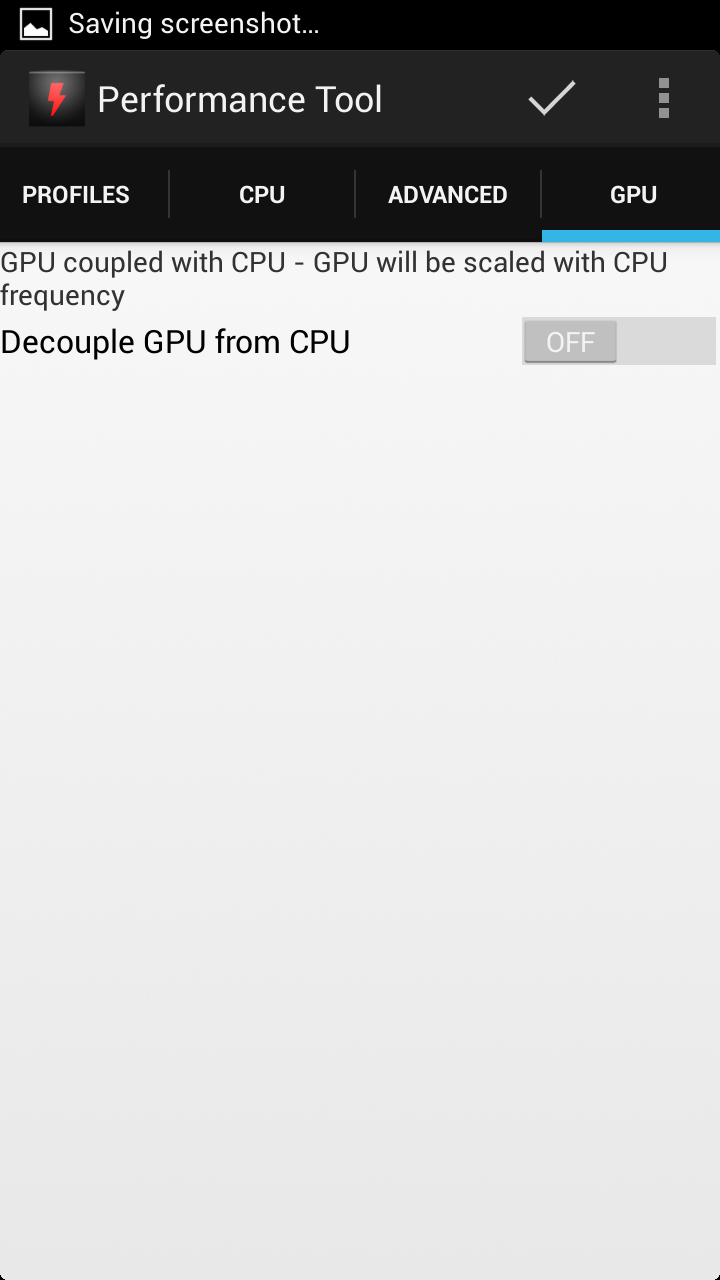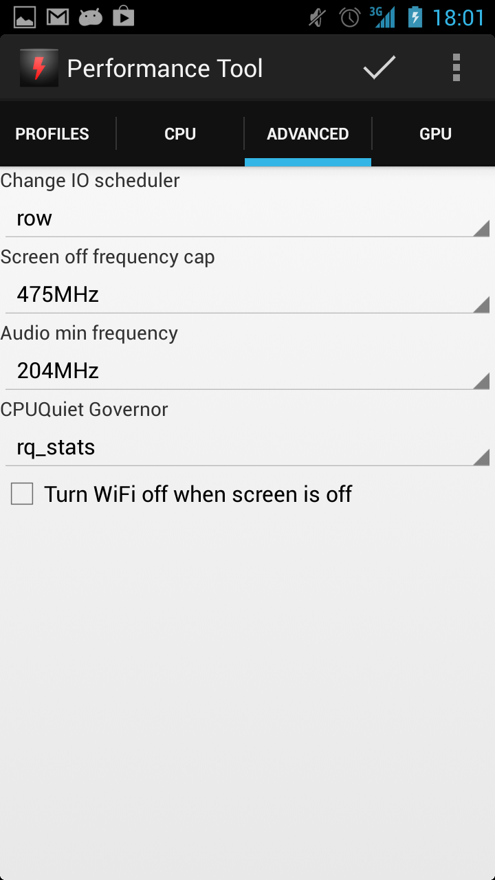 01/06/13: - Changed GPU Settings - Added new icon 19/05/13: - Added GPU settings. - Added option to turn WiFi automatically off. - Keyboard will not show at start up. - UI Changes. 19/04/13: - Added LP OC switch 06/04/13: - Added a widget to toggle trough 3 profiles 03/04/13: - Removed Fix audio lag switch. - Added Screen off frequency cap. - Added Audio min frequency. - Added a profile for the audio fix.
