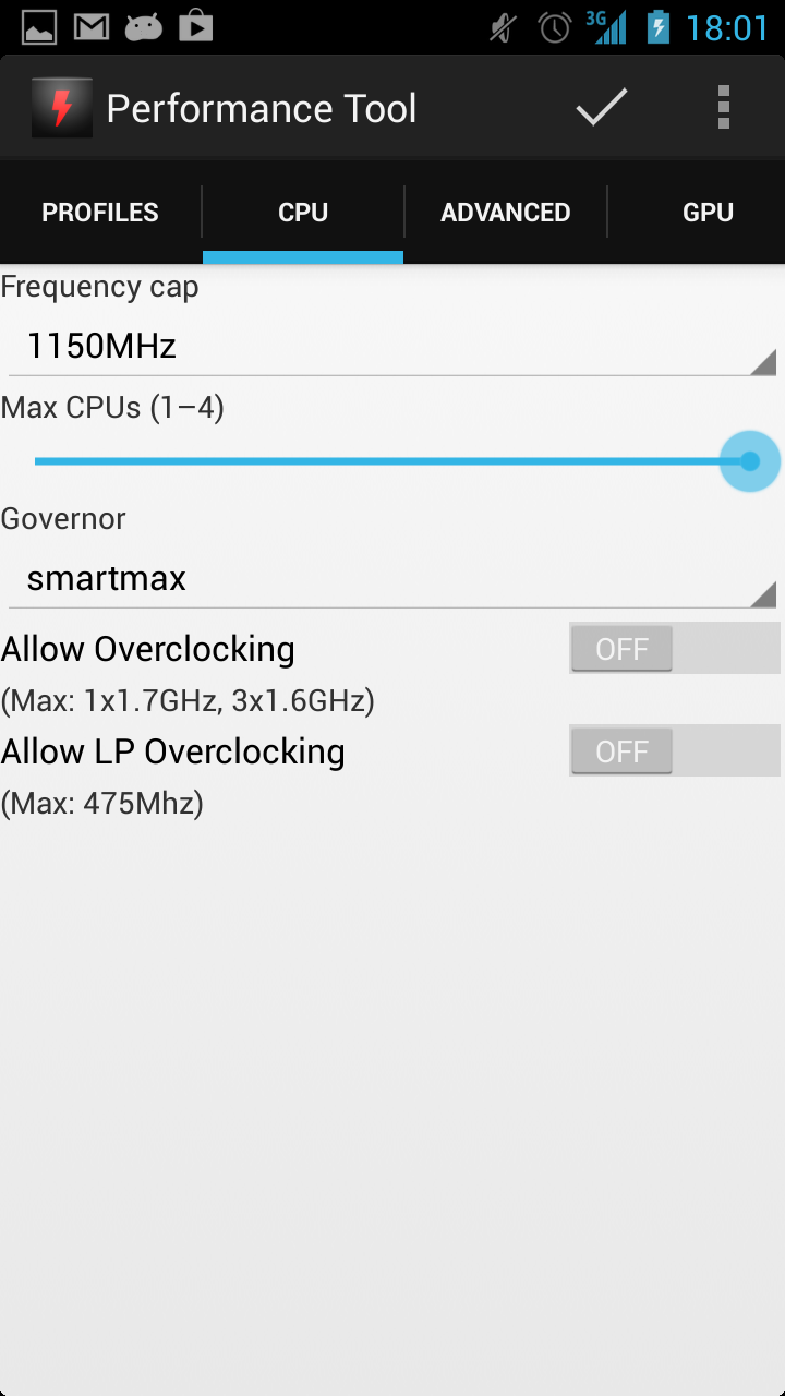 This is a tool to change the performance of the HTC One X+ BLADE kernel. This will not work on other kernels. You can change the following settings: - Change the CPU frequency cap. - Change the CPU governor. - Change the memory scheduler. - Change frequencies for screen off and audio. - Change GPU settings. - Enable 1.7GHz on all the cores (OC). - Set on boot. - Widget to toggle trough the Default, Audio and Power Saver profile. You can also save changes to profiles. This can be done by selecting (You don't have to apply) the settings you want, fill in a name, and press the add button. Now a profile can be set by tapping it. Long tap for more options. I am not responsible for any damage caused by this app.