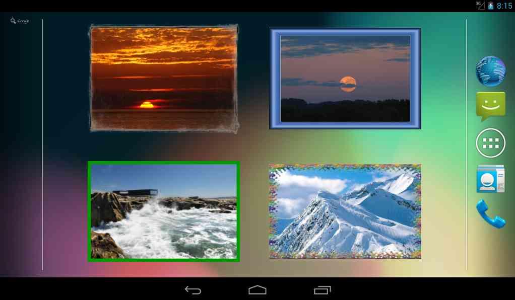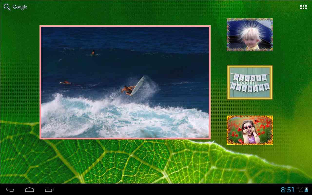 Add your favourite pictures on Home! *** This is a WIDGET, not an app, long press on home screen and choose Widgets to add and configure it! *** This WIDGET offers 3 different sizes, searching picture on your sd-card. Recursive scan, many borders, option to randomize the order, timed slideshow, image rotation and full screen view with pinch to zoom! Download full version for 12 sizes, image search on Google and Picasa integration! Please visit website for info and report any issue