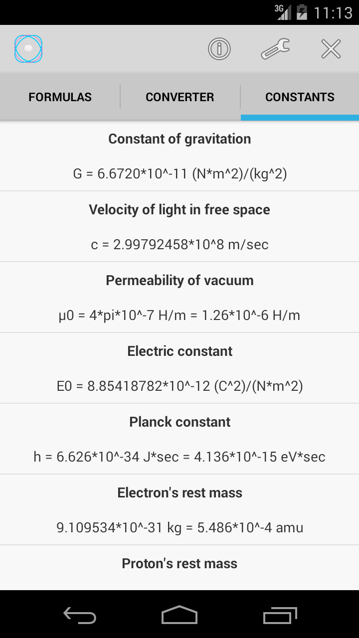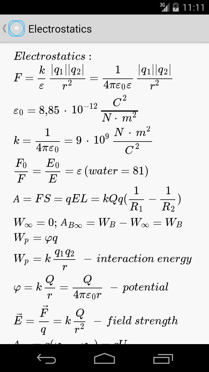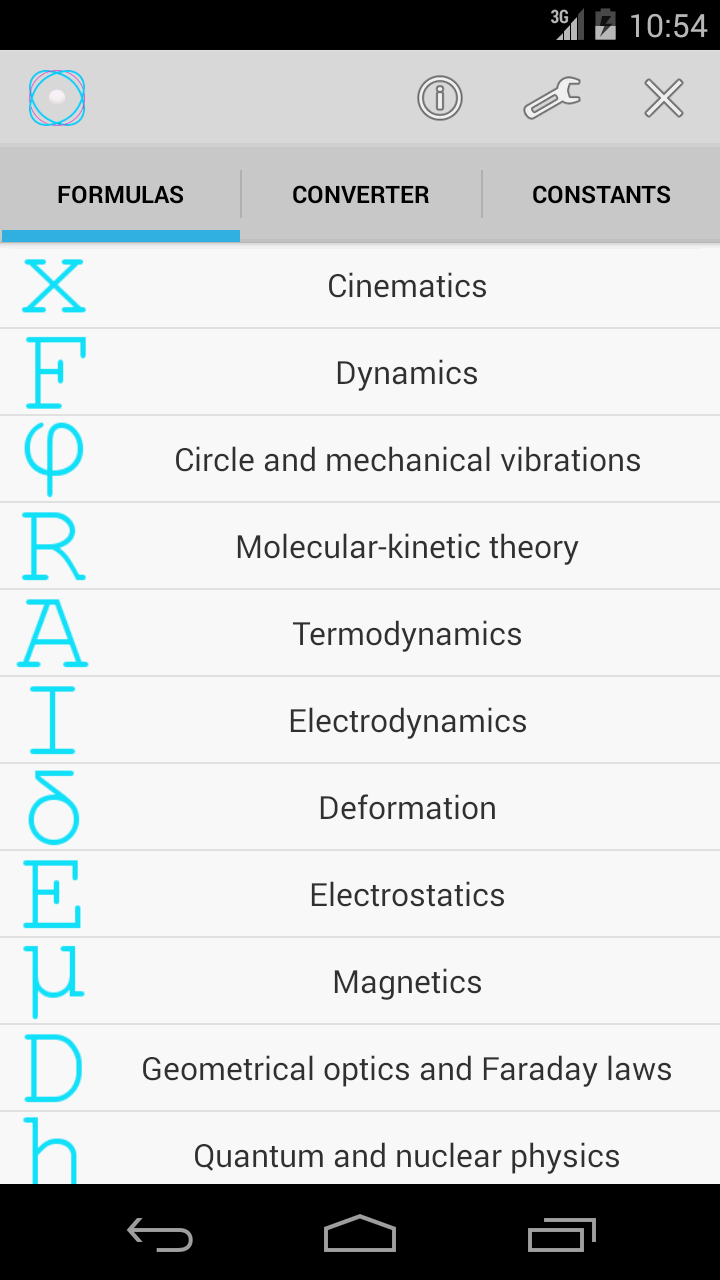 Physics Lab is a collection of most physical formulas included in the school curriculum, the converter of physical quantities and the database of basic physical constants.
