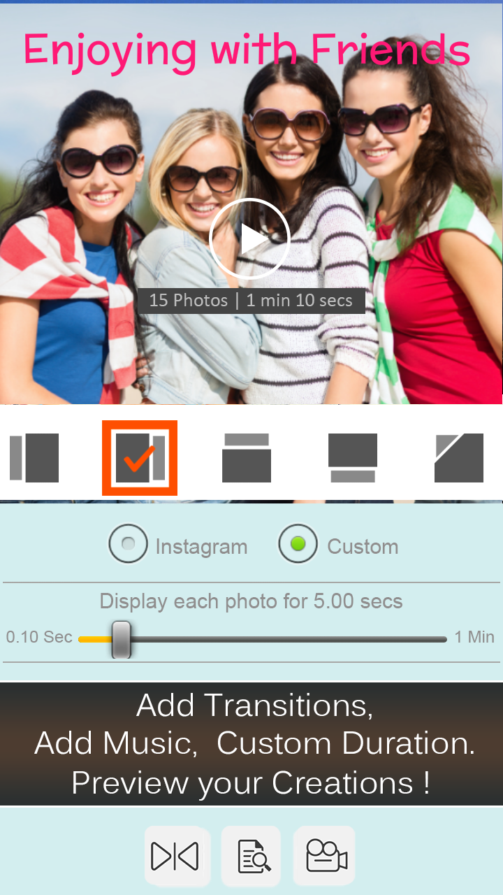 ➜ Fine tune the time duration / length of your stitched video OR easily set to Instagram size (15 seconds) with slideshow maker.