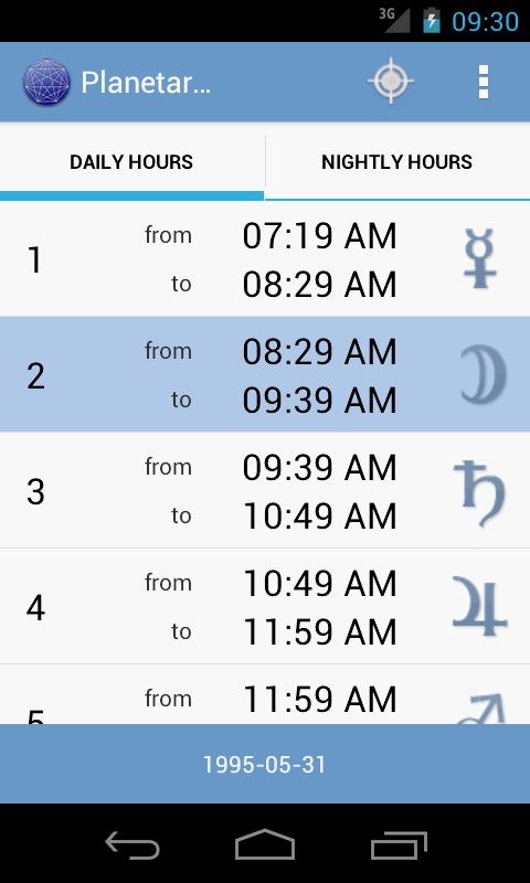 For most magical traditions, ancient and modern, the vibrations of the planets affect different parts of the day and the night. The two parts of each day - the bright one and the dark one - are broken down into twelve hours, each tied to a particular planet and influenced by it. Planetary Hours is a free Android App to instantly calculate the associations between the Planets and the 24 portions of each day called Hours, referred to a certain date and location. The calculation is based on the time of sunrise and sunset, and these are information related to geolocation. Set the location infos through the Compass icon on the action bar or through the menu item Set Location; tap the Geolocate button to retrieve the information through the sensors of your device or fill yourself the text boxes. The reference day is always the current one in a planetary sense: if today is February 3rd 2 in the morning, the day February 2nd will be considered because the dawn of February 3rd is not yet born. The current Planetary Hour is highlighted with a blue ribbon. PRO version available! NB: Latitude and Longitude are expected in decimal degrees; Altitude is expected in meters. ★ Features - Set location to immediately calculate the Planetary Hours - Detect your location using the device's sensors - The current Planetary Hour is highlighted by a blue ribbon - Choose your favorite time format: 12h or 24h - Choose your favorite date format: dd-mm-yyyy, mm-dd-yyyy, yyyy-mm-dd - You can turn on and off the ads in the Settings screen - Move to SD card - ICS look and feel - Portrait and landscape layout - Localized in English and Italian