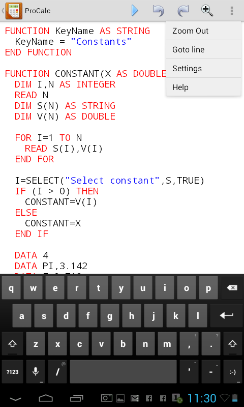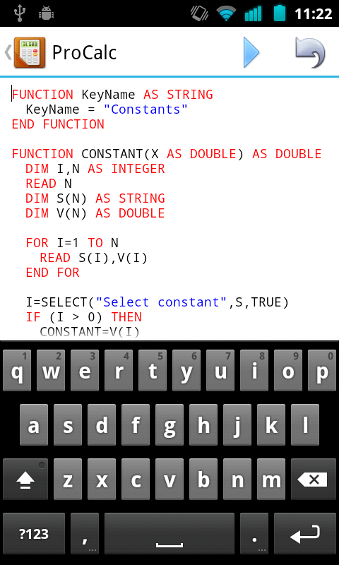 • BASIC Interpreter with 10 data types (Boolean, Byte, Complex, Double, Float, Integer, Long, Short, String and Variant) and wide range of functions including:- calculator memory access, reading and writing files, 51 maths functions, 11 string functions, 12 date and time functions, 29 graphics functions, 3 graph drawing functions, 3 touch screen functions and a couple of functions for generating messages and prompting for data input.