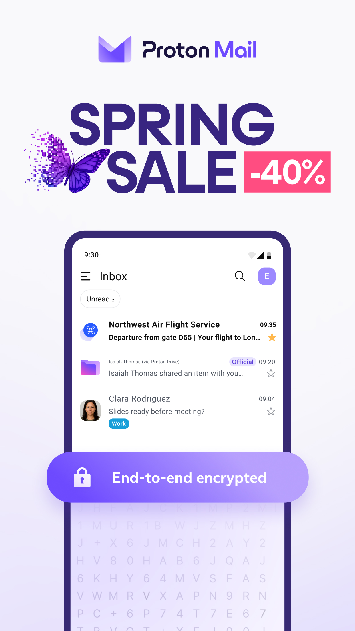 • Rigorous encryption — Your inbox is secured on all your devices. No one can read your emails but you. Proton is privacy, guaranteed by end-to-end and zero-access encryption.