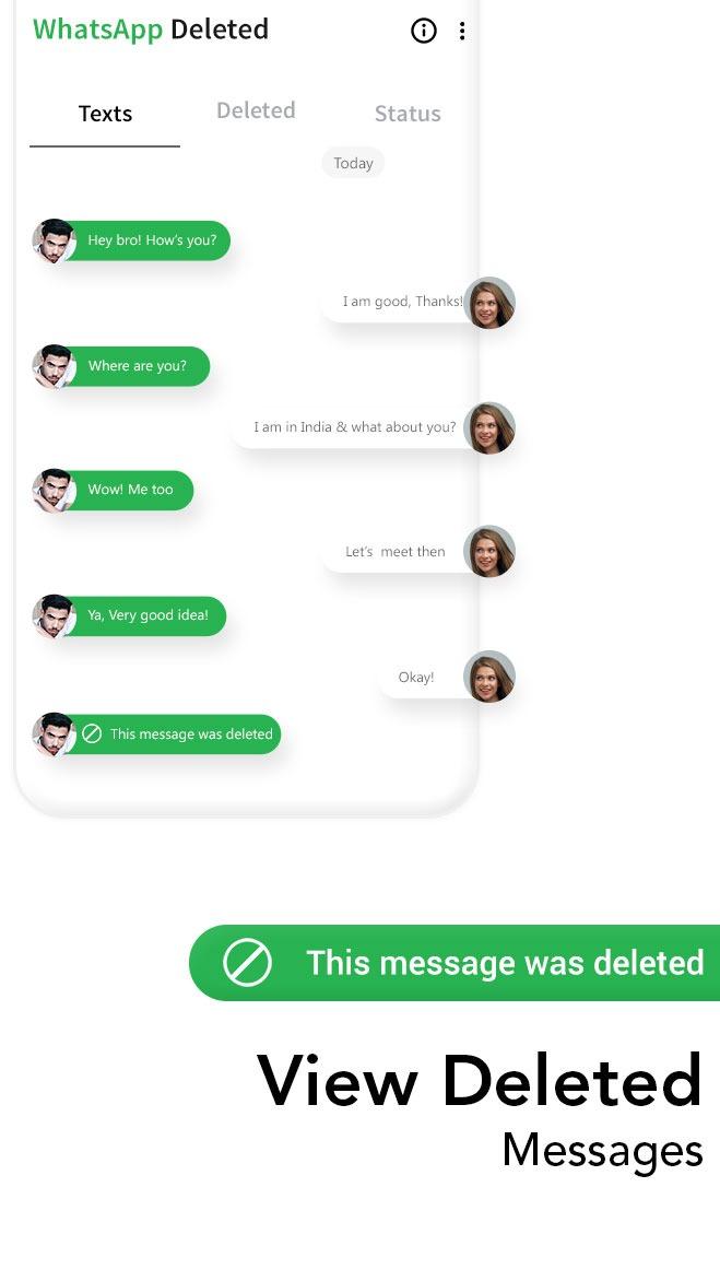 ● Recover Deleted Messages-Restore Deleted chats help you easily recover deleted data as Deleted photos, Deleted videos, Deleted gifs, Deleted voice notes from your phone storage.