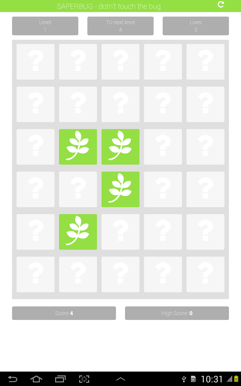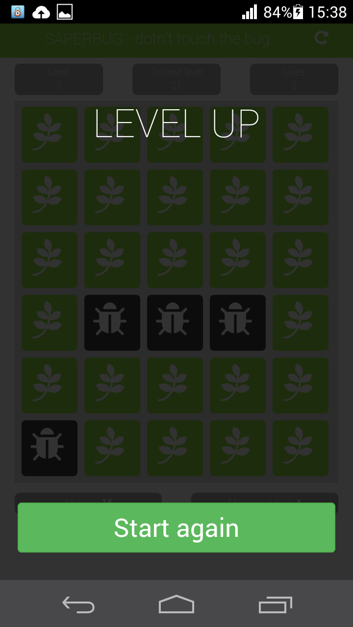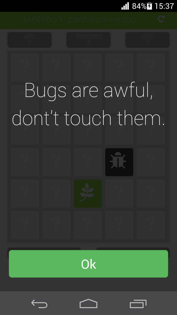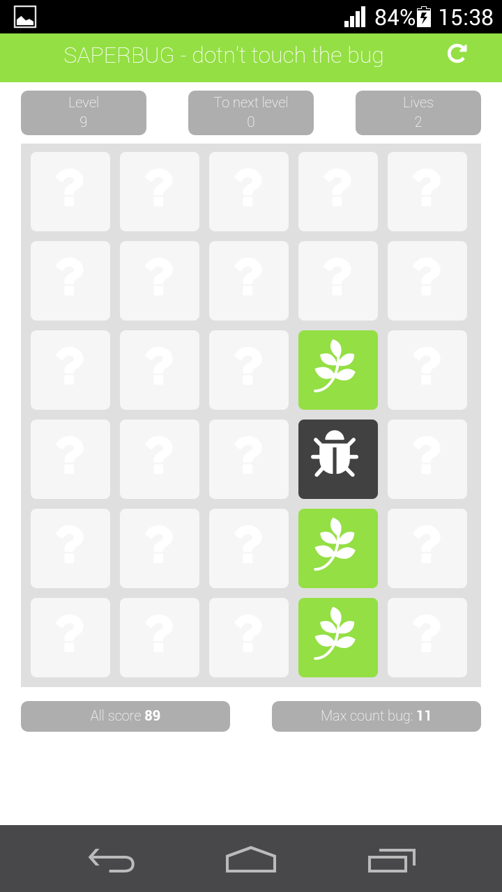 Looking for a exciting game, with a complicated plot? Unfortunately, this is not good idea. What is SaperBug? Game of unusual action algorithm, which ensures that it never go. How does it work? It's easy! Spontaneously discover card. The green of the leaves are OK. But watch out for the black worms enough to discover three and step back on level. Why? Just like that, just to kill the boredom.