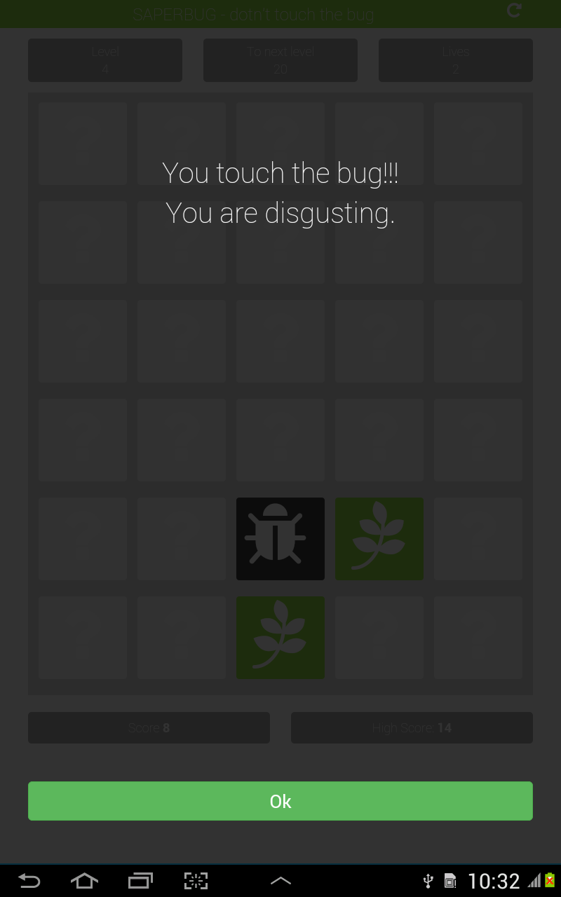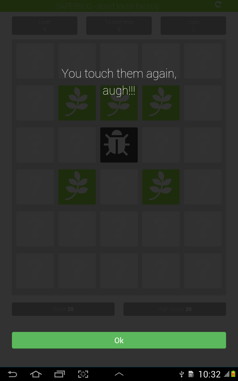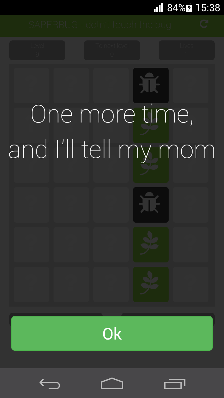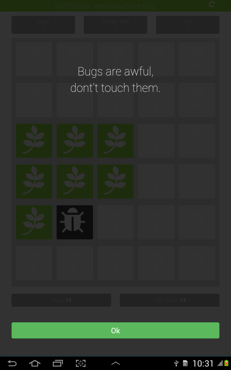 Looking for a exciting game, with a complicated plot? Unfortunately, this is not good idea. What is SaperBug? Game of unusual action algorithm, which ensures that it never go. How does it work? It's easy! Spontaneously discover card. The green of the leaves are OK. But watch out for the black worms enough to discover three and step back on level. Why? Just like that, just to kill the boredom.