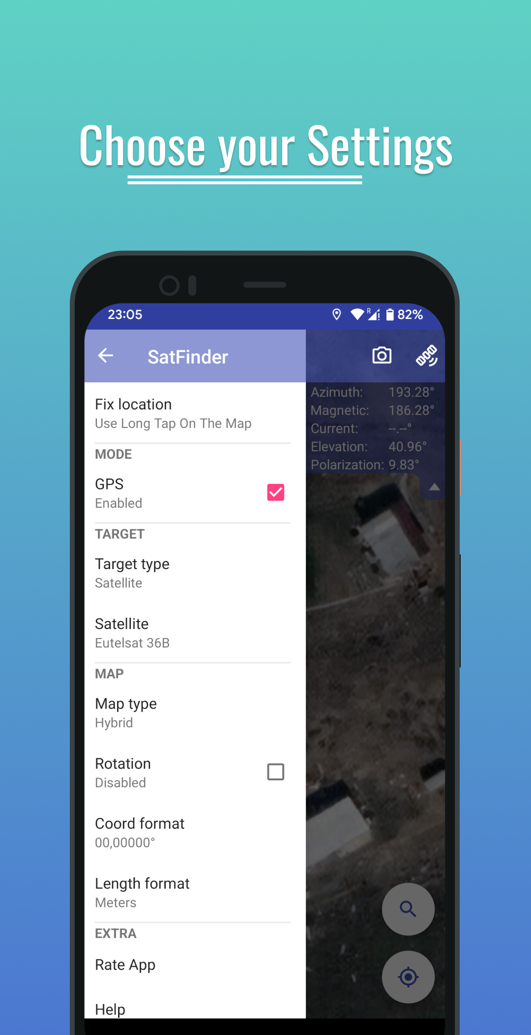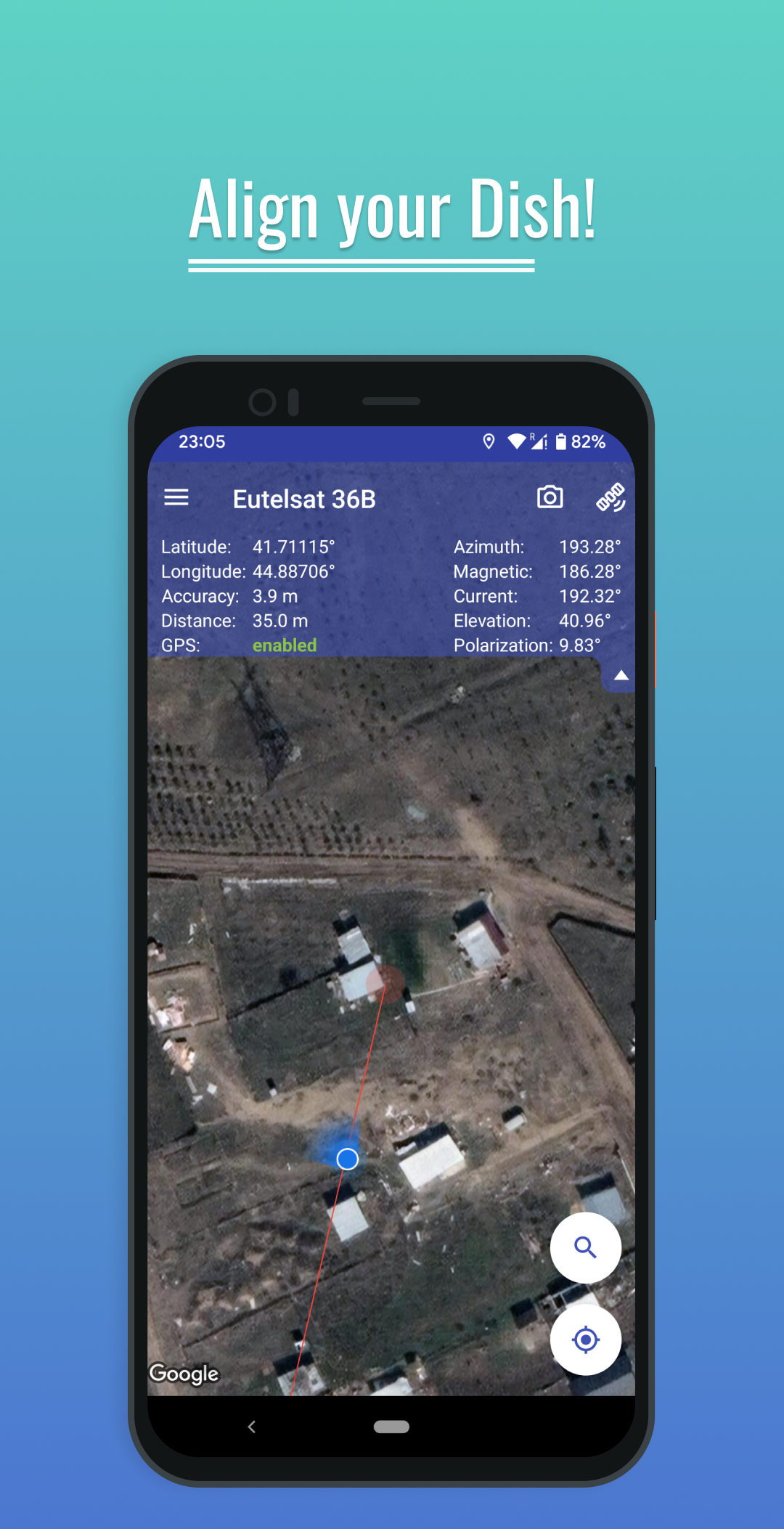 3) 找到天線設置的預期位置並長按固定 → 將顯示方向指示器和對齊參數,現在您可以查看地圖並決定該位置是否合適或最好找到另一個位置。