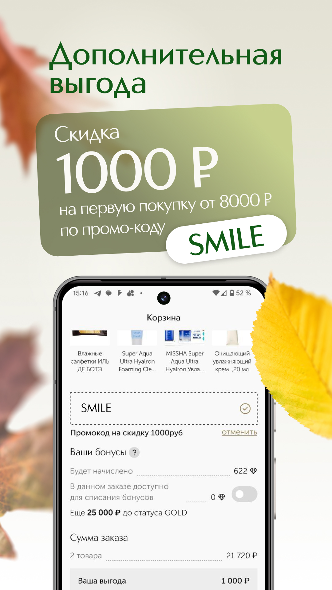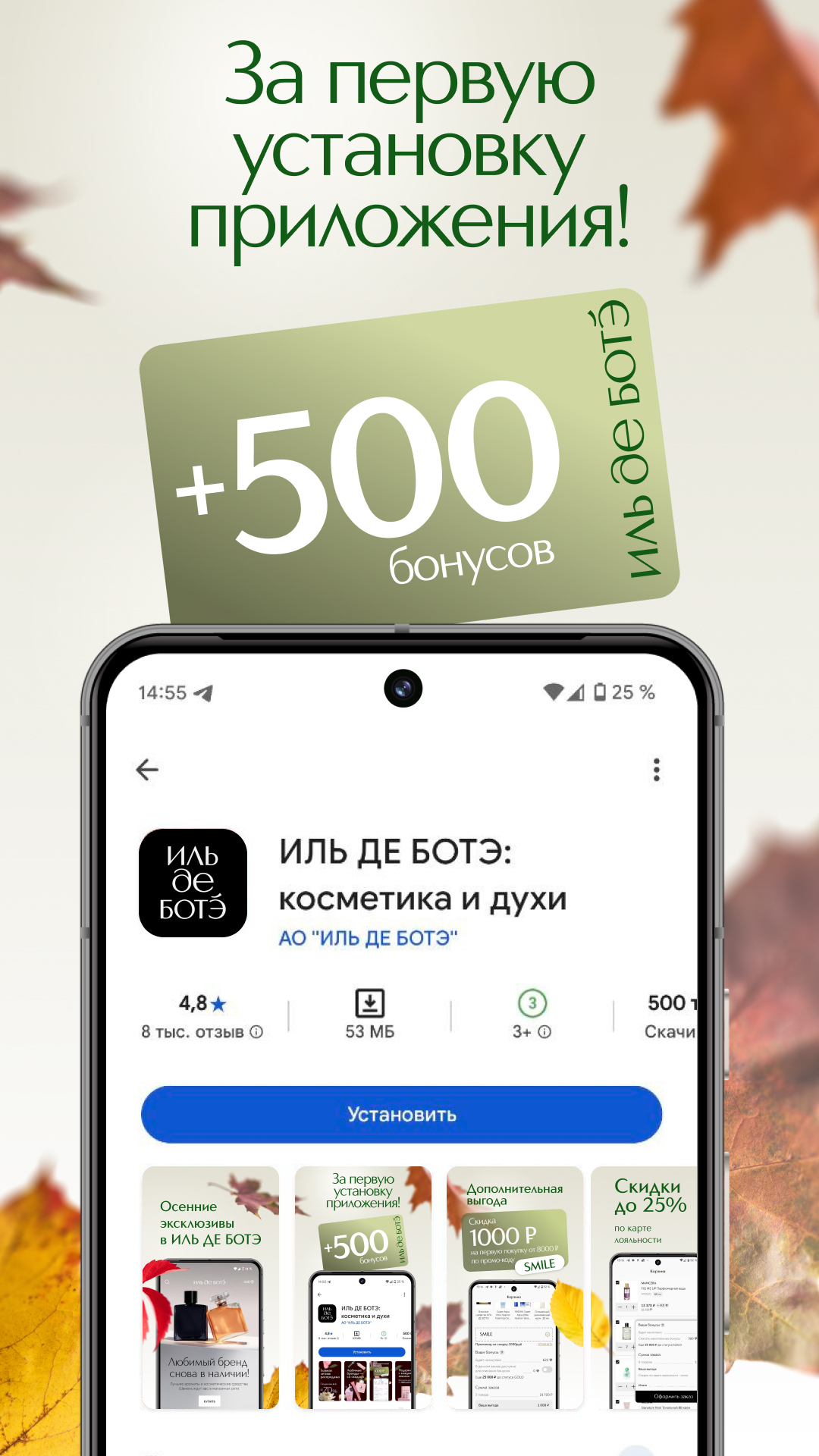 享享優惠 - 首次消費滿 8000 盧布或以上,使用優惠碼 SMILE 折扣 1000 盧布。加入 ILE DE BEAUTE,探索美妝世界!首次註冊 ILE DE BEAUTE 手機 App,即可獲得 500 盧布贈品,適用於任何香水和化妝品。