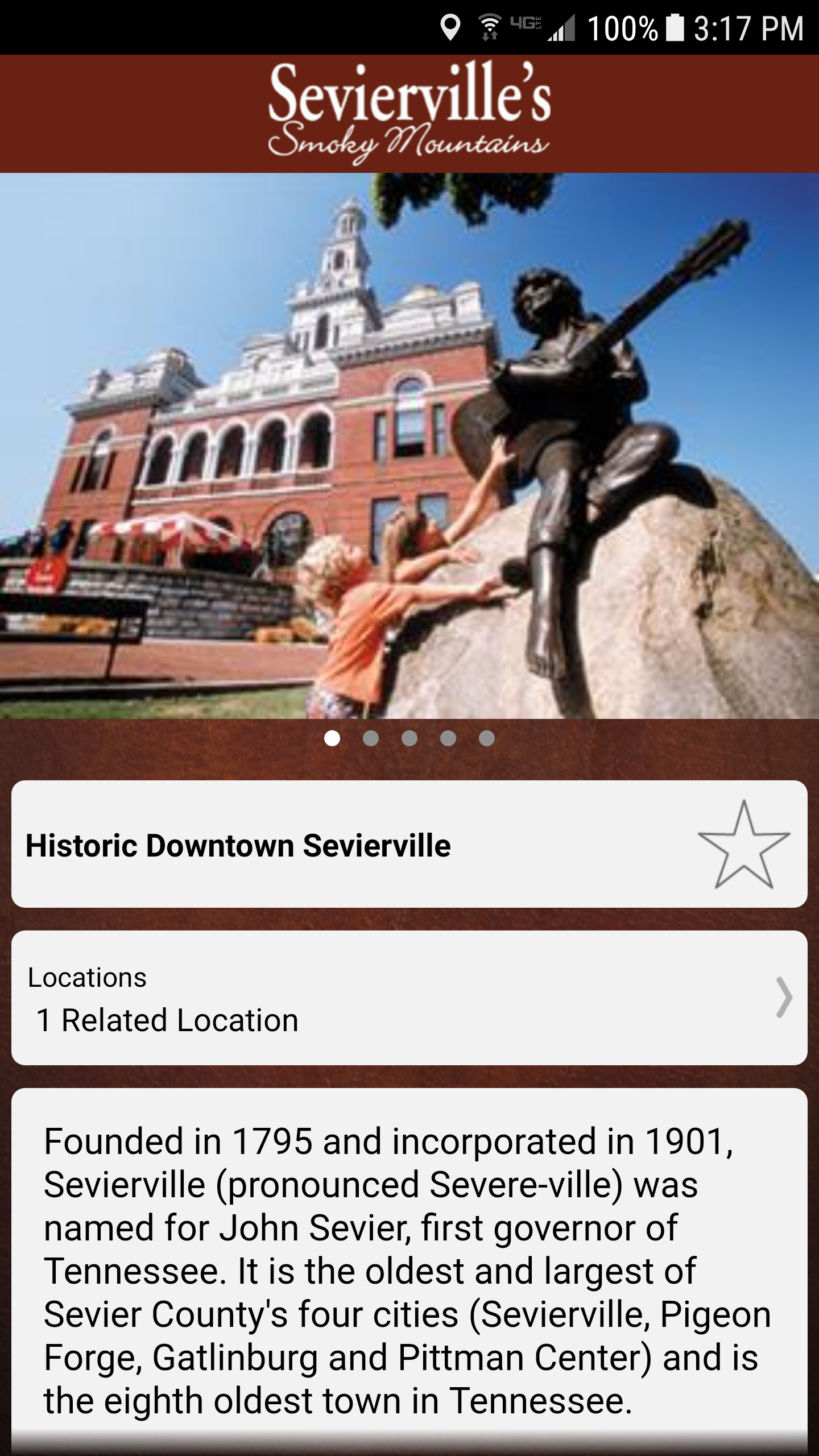 The Sevierville’s Smoky Mountains app has an easy to use interface that enables you to quickly download the application and start enjoying the tours, deals and fun of Dolly Parton’s Hometown, Sevierville, Tennessee within a few seconds! After you’ve downloaded the application, choose to stream or download the tours, coupons and more as you explore Sevierville, Pigeon Forge, Gatlinburg and the Smoky Mountains. The streaming format saves hard drive space on your device and avoids the time association with large downloads. However, downloaded material and tours can be enjoyed without Wi-Fi or 4G connectivity (which is important if you plan to access the app while in the Great Smoky Mountains).