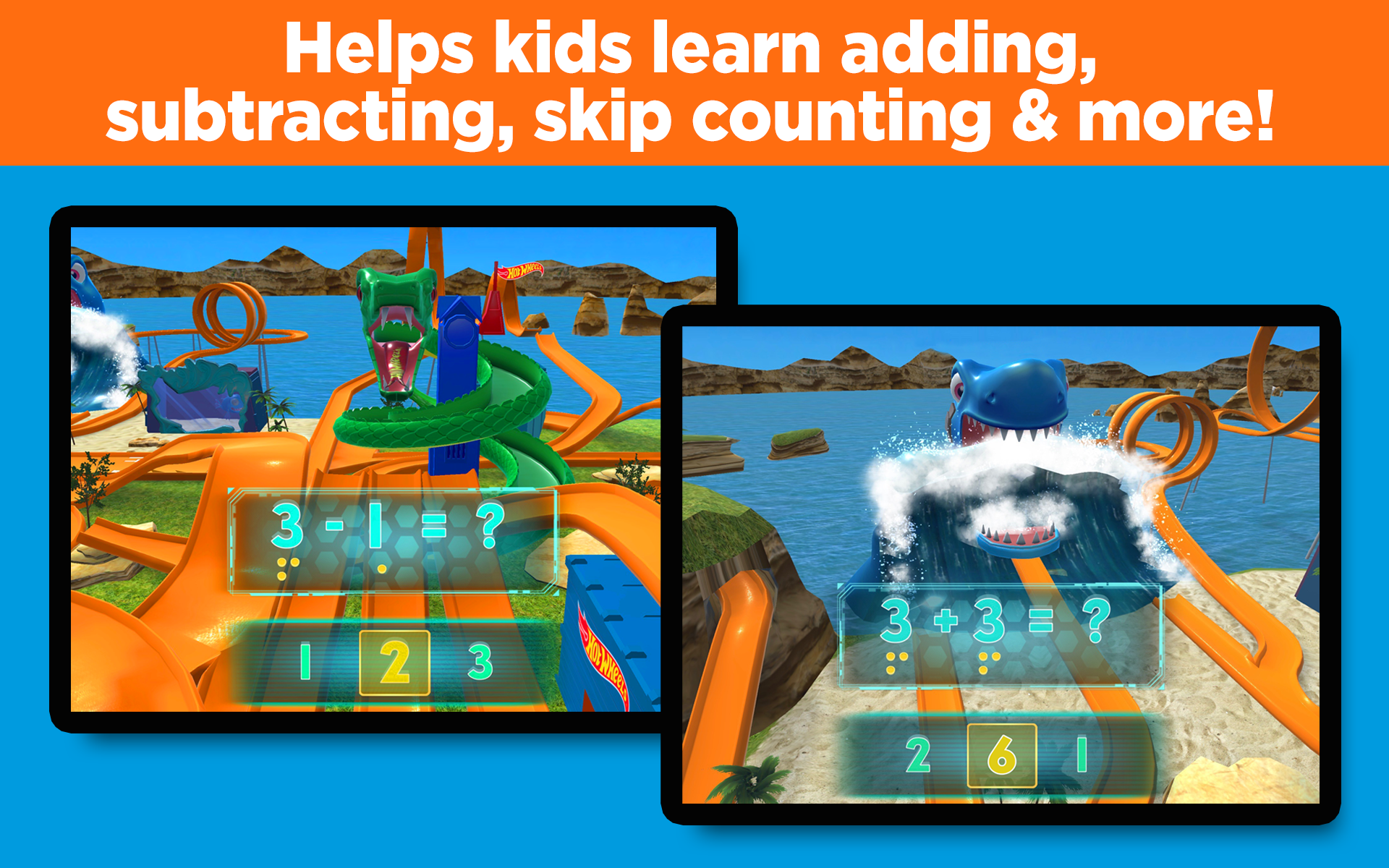 SUPERCHARGER CHALLENGES! Kids who add and subtract in two different challenges are rewarded with a huge speed boost across some of the most interesting track sections in the game. In the Shark Blast Challenge and Cobra Crunch Challenge kids are presented with addition and subtraction math problems — get the number of cars into the shark’s mouth and cobra’s mouth correctly and be turbo boosted past them to continue their race!