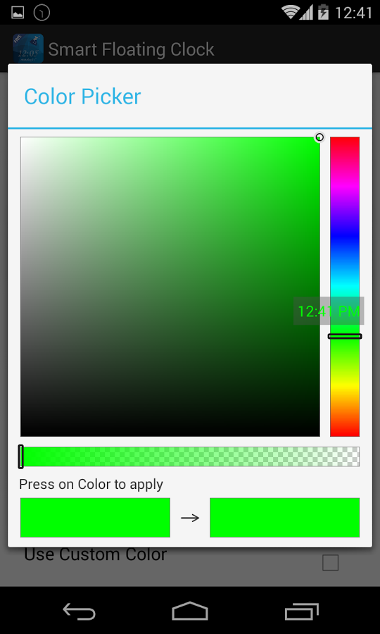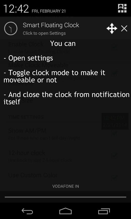 It's Smart because the Clock stays on top, still you can click through it! - A text only clock stays always on top, floating - When its set to not movable, you can click through it. - Text size, color and position can be customized - You can select to show AM/PM - You can select 24 Hrs or 12Hrs format - Date can be visible or hidden - Date color and format can be changed, we have many date format options available - Auto-magically manages its position in landscape and portrait modes. - You can open settings, toggle clock mode to make it movable or not or close the clock directly from notification - Ongoing notification is must to keep the clock alive, if you disable it, clock will be closed anytime. - If you messed up the position of the clock or want to reset your changes, just click on reset all settings!