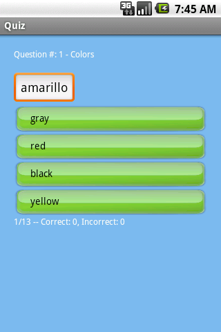 This is the "Lite" version of our "Spanish Trainer - Pro" app. Learn common Spanish vocabulary with study lists, flashcards, and quizzes. Version 1.0.2 * Retest only missed questions. Word groups include: * months, days of the week * food * animals * basic numbers * fruits, vegetables * family * colors