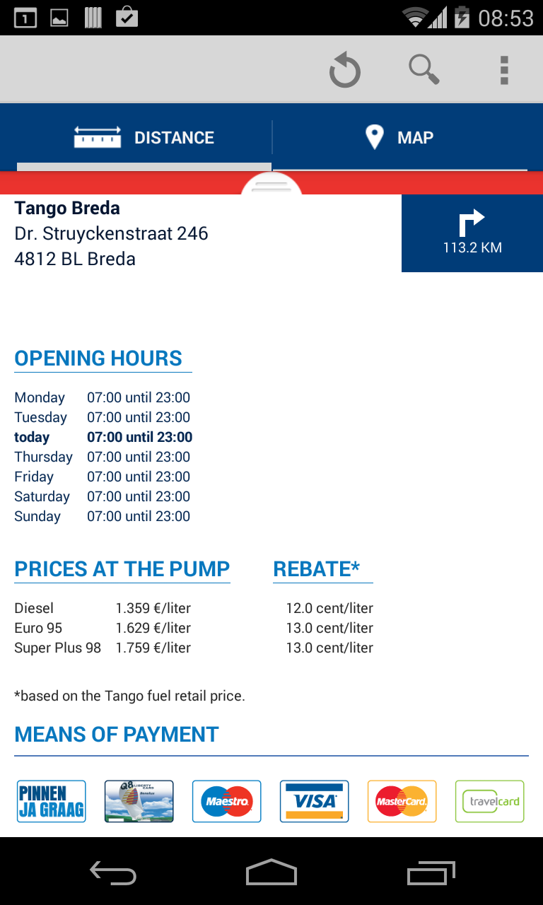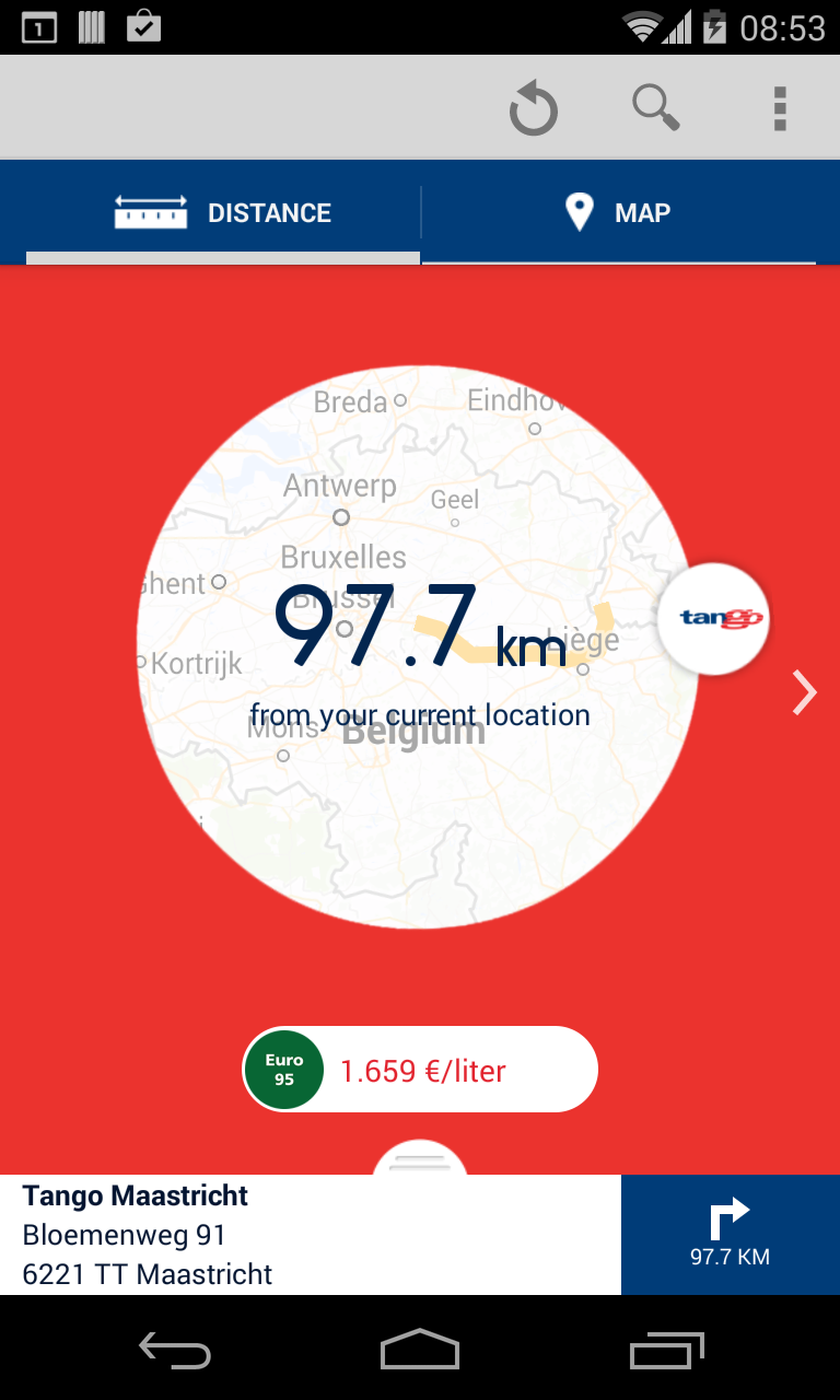 Vind altijd de dichtstbijzijnde Tango, waar je ook bent. Zie direct de actuele prijzen en openingstijden. • Altijd het dichtstbijzijnde Tango tankstation. • Plan je route en vind altijd een Tango tankstation in de buurt of langs je route. • Duidelijk overzicht van openingstijden, betaalmogelijkheden en brandstofprijzen. Wat tank je zelf? Tango