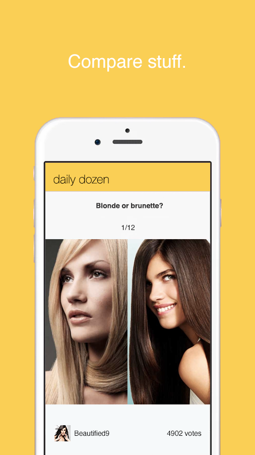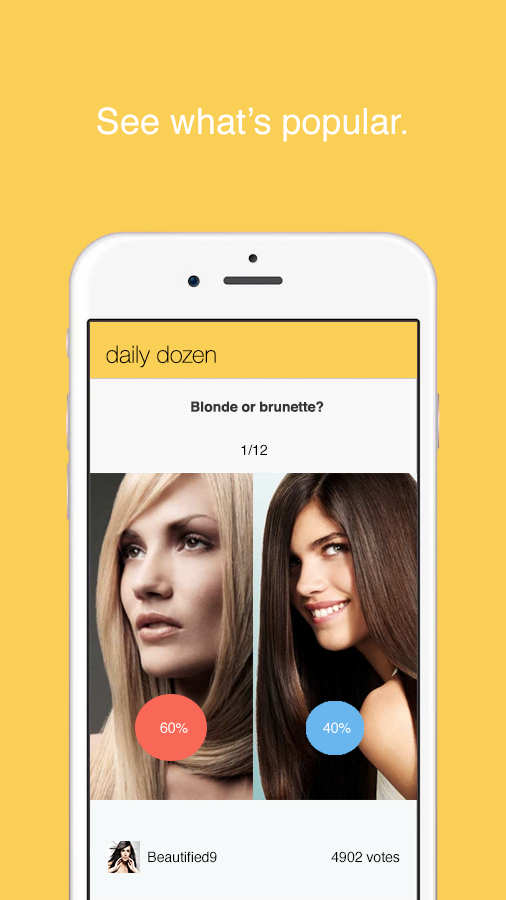 TossUp makes social content more fun. Everyday get a set of 12 pop culture-based questions with two choices. When you vote on a side you can see how others voted. See what's trending across fashion, celebs, sports, music and more! Jolie or Fox? Zipper or buttons? Vote and see what's popular!