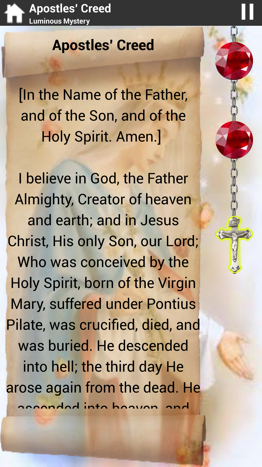 Note: To support the continual development of this application, a small ad is displayed on the bottom of the home screen. However no ad is displayed on the Rosary screen itself so as not to interfere with your prayers.