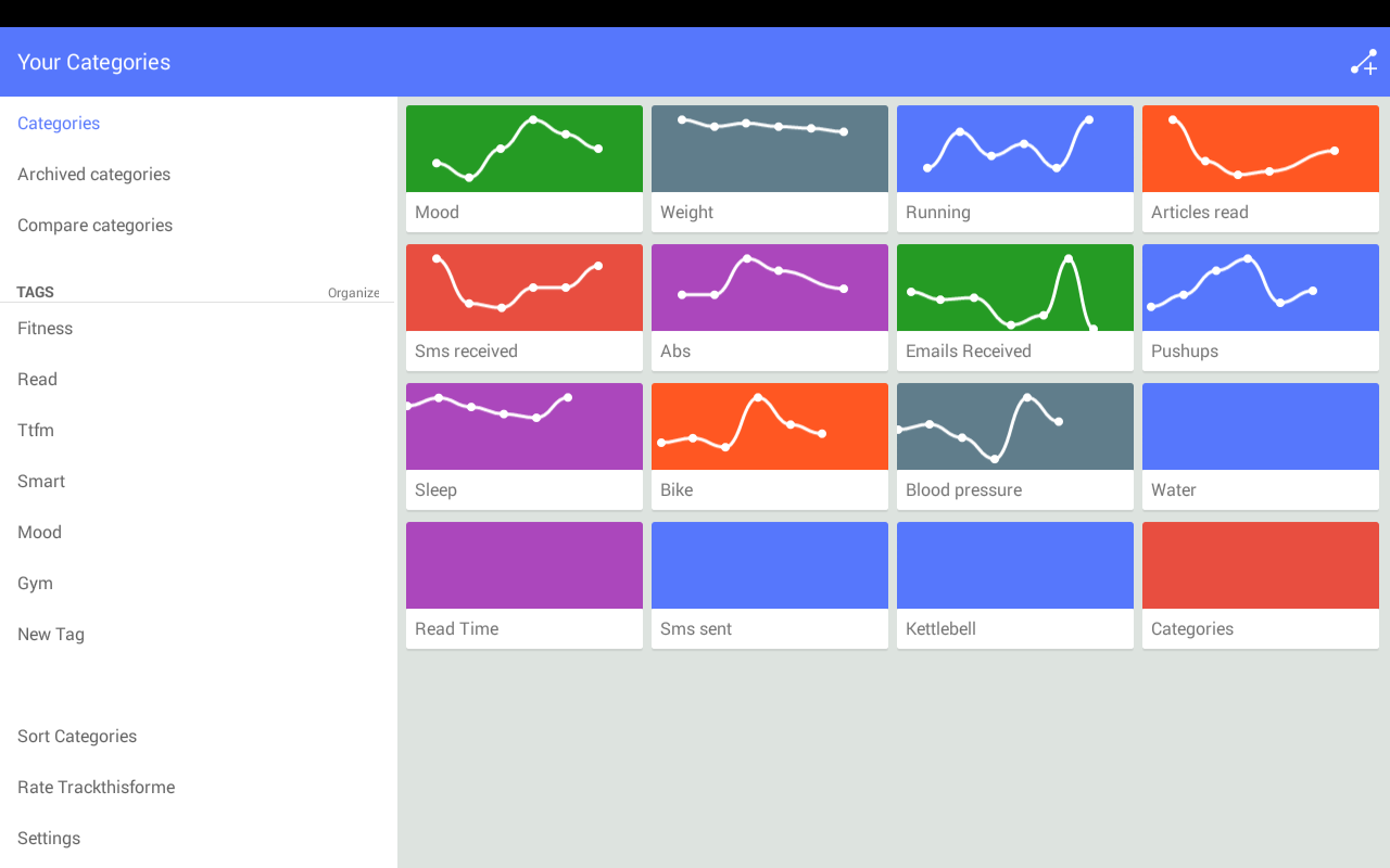 Keep track of the sleep hours, your daily mood, biking distance, mugs of coffee and so on. Everything is trackable with trackthisforme!