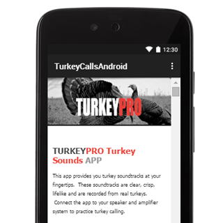 Want affordable and realistic turkey calling sounds? The TurkeyPro turkey calls app provides you turkey calls at your fingertips. These turkey calls are clear, crisp, lifelike and effective for learning. Five 15 minute soundtracks included. Connect the app to your speaker and amplifier system to listen to these real turkey calls louder as you practice or use your phones speakers alone. FEATURES: - 5 snow turkey calling soundtracks, 15 minutes each - Effective, realistic and clear audio recorded from real turkeys - Bluetooth compatible to sync to a Bluetooth receiver to play even louder as you practice - Sounds can play in the background of your phone allowing you to text, take pictures and surf the internet without interrupting the turkey sounds - 15 minute soundtracks allow you to set the call and focus on practicing to match the sounds - Connect to your speaker system with audio cables (cables not included) - No more buying multiplet MP3s or memory cards, use the phone you already have - Real turk audio soundtracks at a fraction of the cost of purchasing multiple soundtracks and memory cards separately Soundtracks included in "TurkeyPro" - Turkey Gobble (15 Minutes) - Turkeys Communicating (15 Minutes) - Aggressive Turkey (15 Minutes) Purr (15 Minutes) Yelp (15 Minutes) - Mixed Bag (15 Minutes) Download TurkeyPro today!