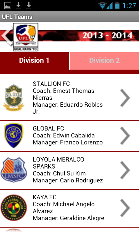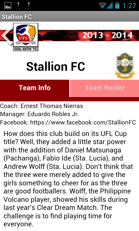 The Android app for the United Football League Philippines. View the latest team info, roster, schedules, match results and standings. Only connect to the internet to refresh information. Works OFFLINE saves on LOAD! Update Release Schedules: UFL Cup - Oct 12, 2013 UFL League - Jan 11, 2014 UFL Youth - March 8, 2014