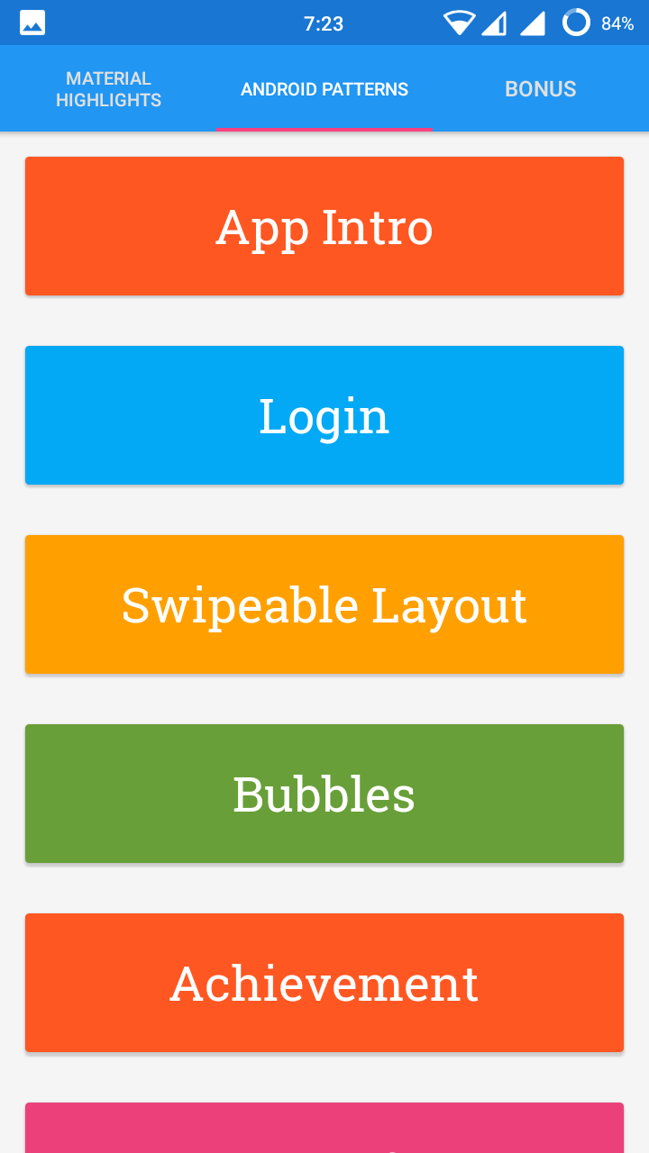 Android PatternsThis Includes all the common patterns of Android App. Such as App Intro, Login, Pull To Refresh, Textview & UI Elements.