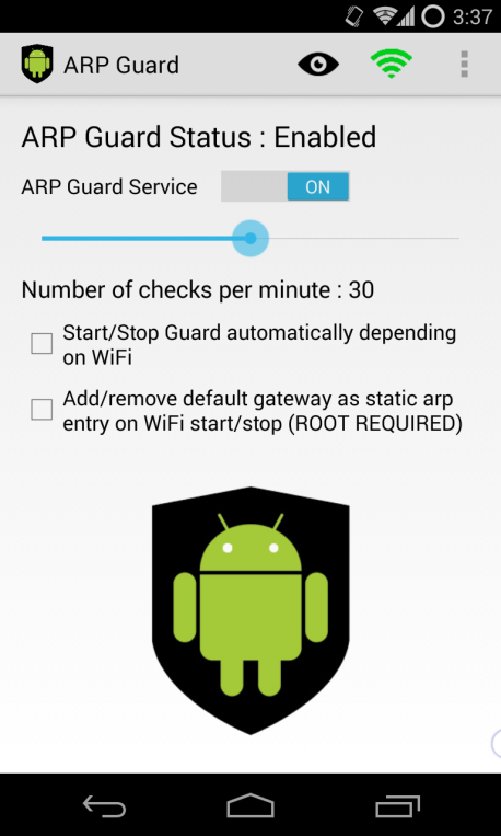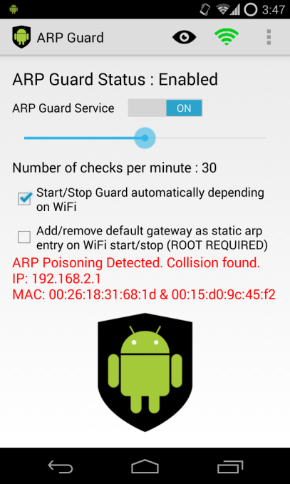[✔] Keep Your Smartphone SAFE from WiFi sneaky-users, intruders, hackers and attackers!!! WiFi ARP Guard keeps you safe from intruders, hackers, attackers and sneaky-users from having access to your WiFi and consequently to your smartphone’s sensitive data. It detects and prevents (rooted only) the “MAN IN THE MIDDLE” attack – Users are instantly informed about possible attacks and have the option to disable the WiFi immediately. View your cache table with a single click and be informed for any “mysterious” alternations or irregularities. Use the WiFi ARP Guard to secure your Facebook, Twitter, ebay, LinkedIn and other online accounts – username/password – especially when accessing WiFi from public places. The WiFi ARP Guard app was developed by Chrosforos Kronis for the ACSC523 - Network Security course of the MSC in Web and Mobile Systems program of Frederick University and supervised by Dr. Hadjichristofi George (co-director of NetLab). If you enjoy WiFi ARP Guard please take a moment to rate it. Thanks for your support!