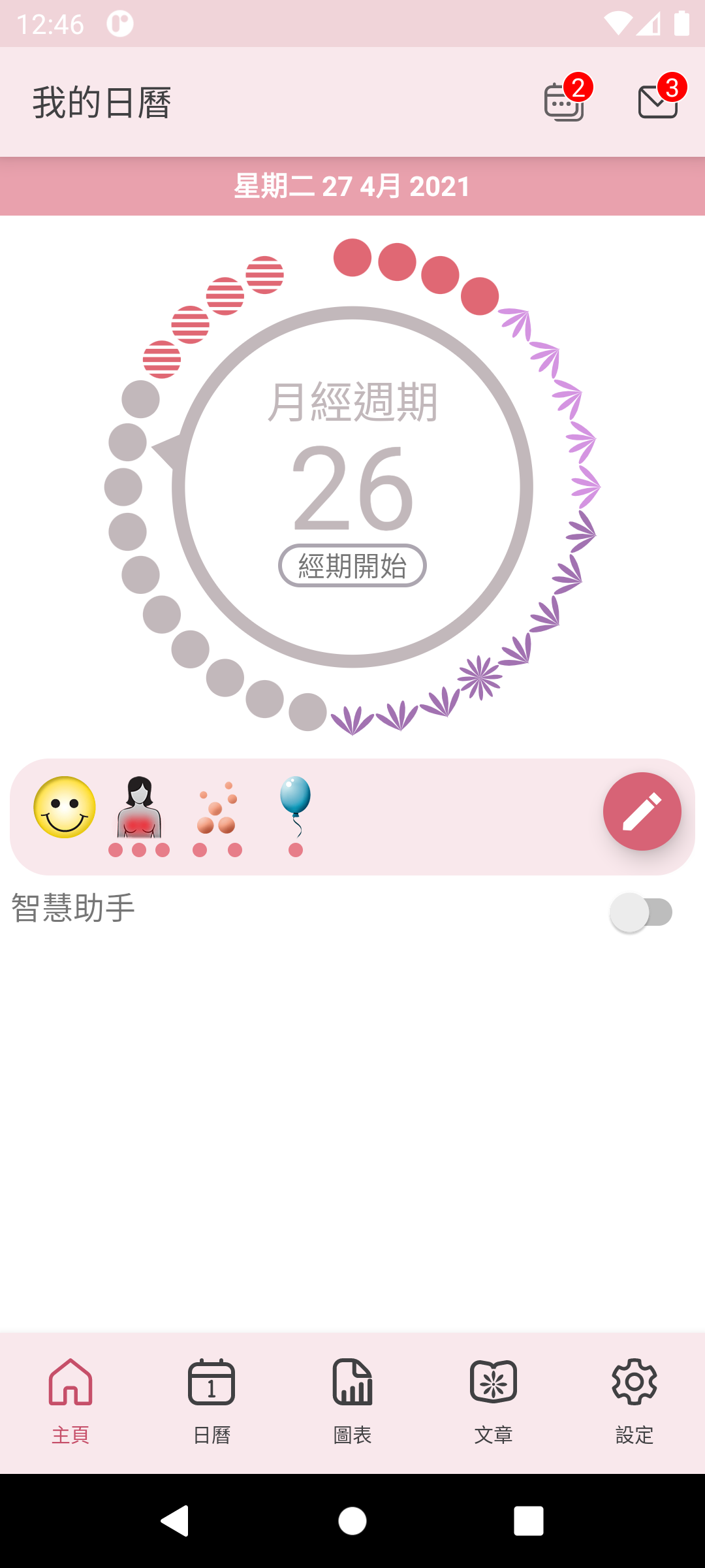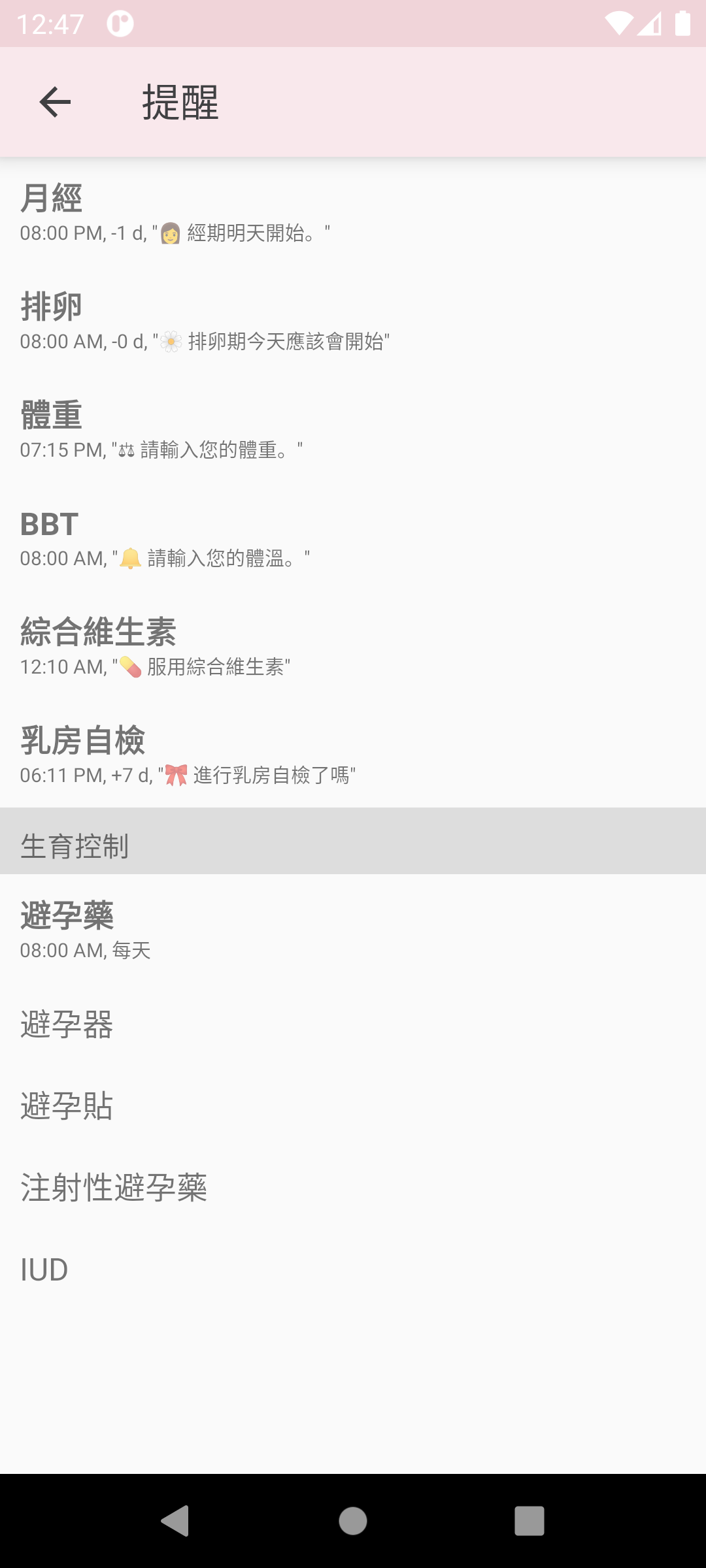 * 各類日常提醒:月經、排卵、體重、基礎體溫、綜合維生素片、乳房自檢、避孕藥、避孕環、避孕帖、甲羥孕酮避孕針、宮內節育器。
