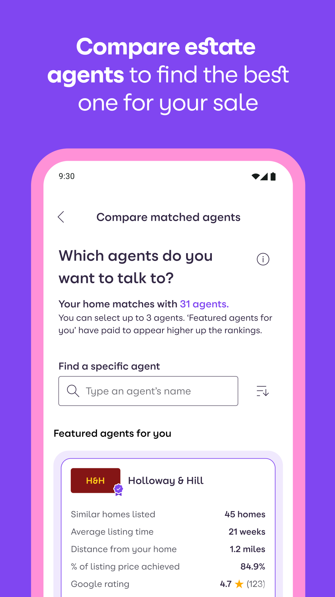 比較不同中介的條件包括:平均掛牌時間、成交價佔要價的百分比、Google評分以及他們目前正在銷售的類似房屋數量。