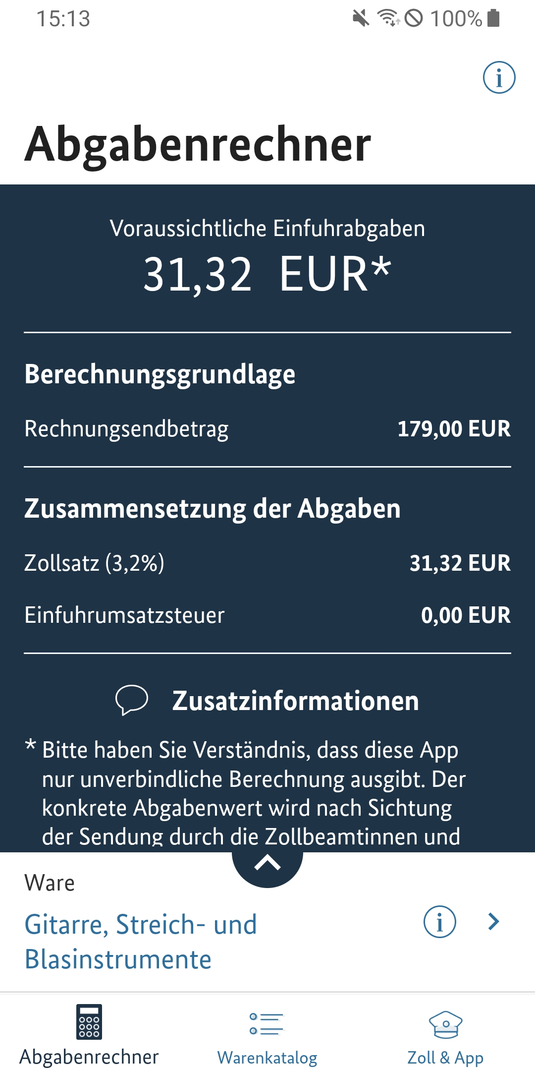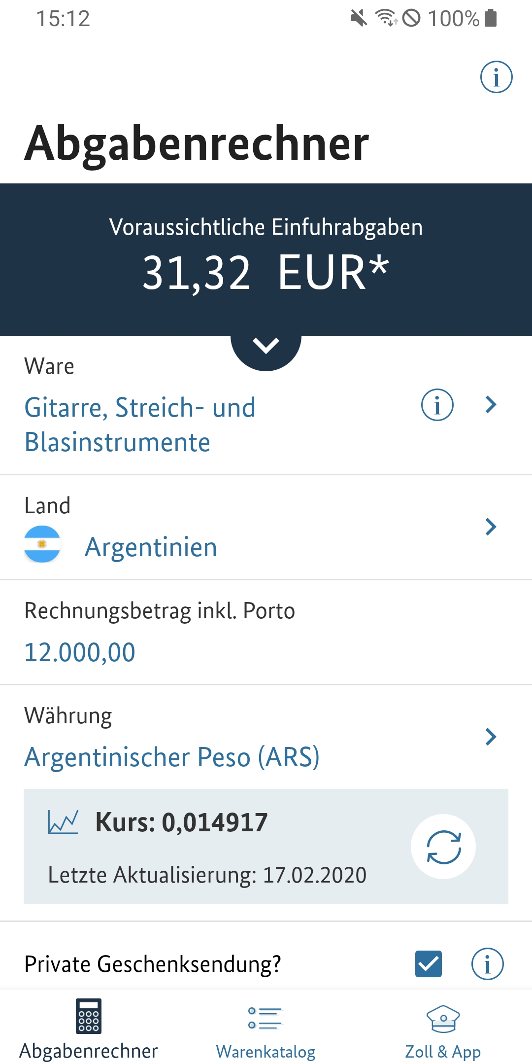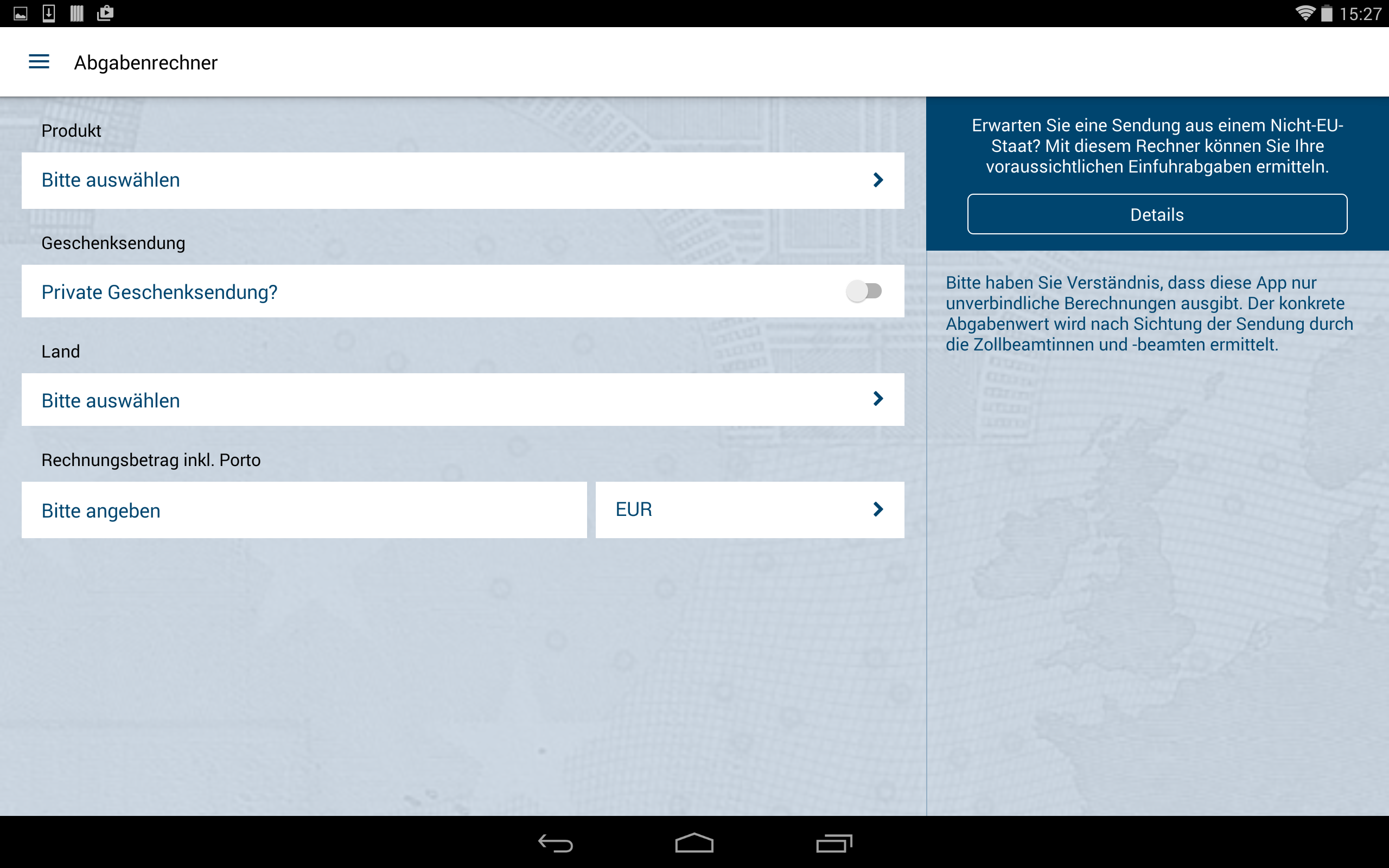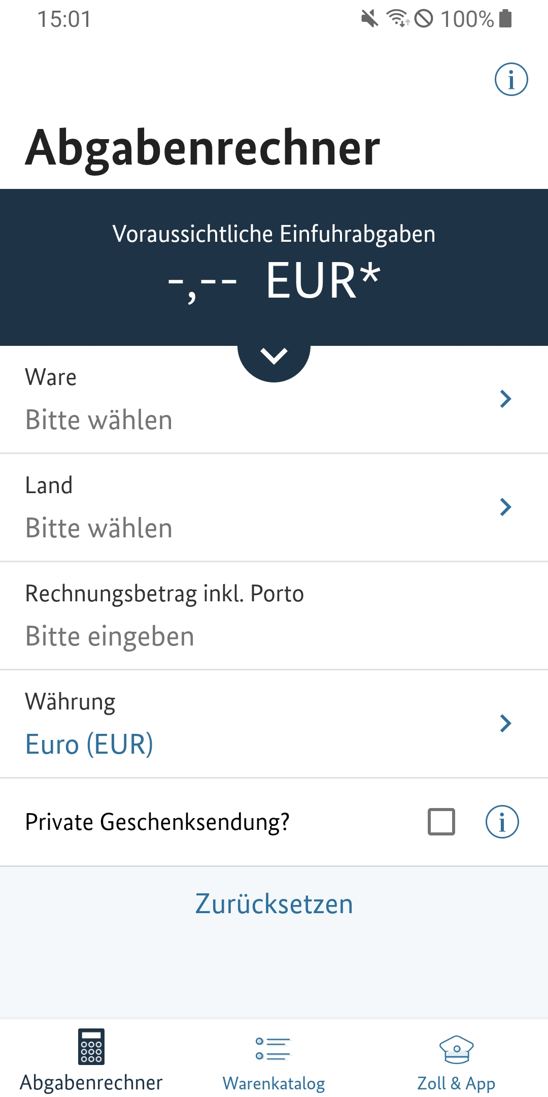 Einige Klicks und schon ist das gewünschte Paar Schuhe oder das neue Handy über das Internet bestellt. Nicht immer ist bekannt: Kommt die Ware aus einem Nicht-EU-Land, werden in vielen Fällen Einfuhrabgaben fällig, die das ursprüngliche Schnäppchen zum teuren Einkauf machen können. Damit Sie auf Nummer sicher gehen können, ob sich der Einkauf lohnt, gibt diese App einen Überblick zur Berechnung und Erhebung dieser Abgaben und auf welche Bestimmungen Sie ergänzend achten sollten. Beispielsweise können gefälschte Waren gesundheitsgefährdend sein, kann ungeprüftes Spielzeug Kinder gefährden oder können nicht fachgerecht produzierte elektronische Geräte brandgefährlich sein. Eine Netzwerkverbindung ist nur für die Aktualisierung der Umrechnungskurse und ggf. zum Aufruf von Links aus der App notwendig. Der Betrieb der Anwendung ist auch ohne Netzverbindung möglich. So entstehen für Sie im Normalfall keine Roaming-Gebühren. Bitte haben Sie Verständnis, dass diese App nur unverbindliche Berechnungen ausgibt. Der konkrete Abgabenwert wird nach Sichtung der Sendung durch die Zollbeamtinnen und -beamten ermittelt. Informationen zum Datenschutz erhalten Sie vorab auf der Website des Bundesfinanzministeriums: www.bundesfinanzministerium.de/datenschutz-zoll-und-post-app