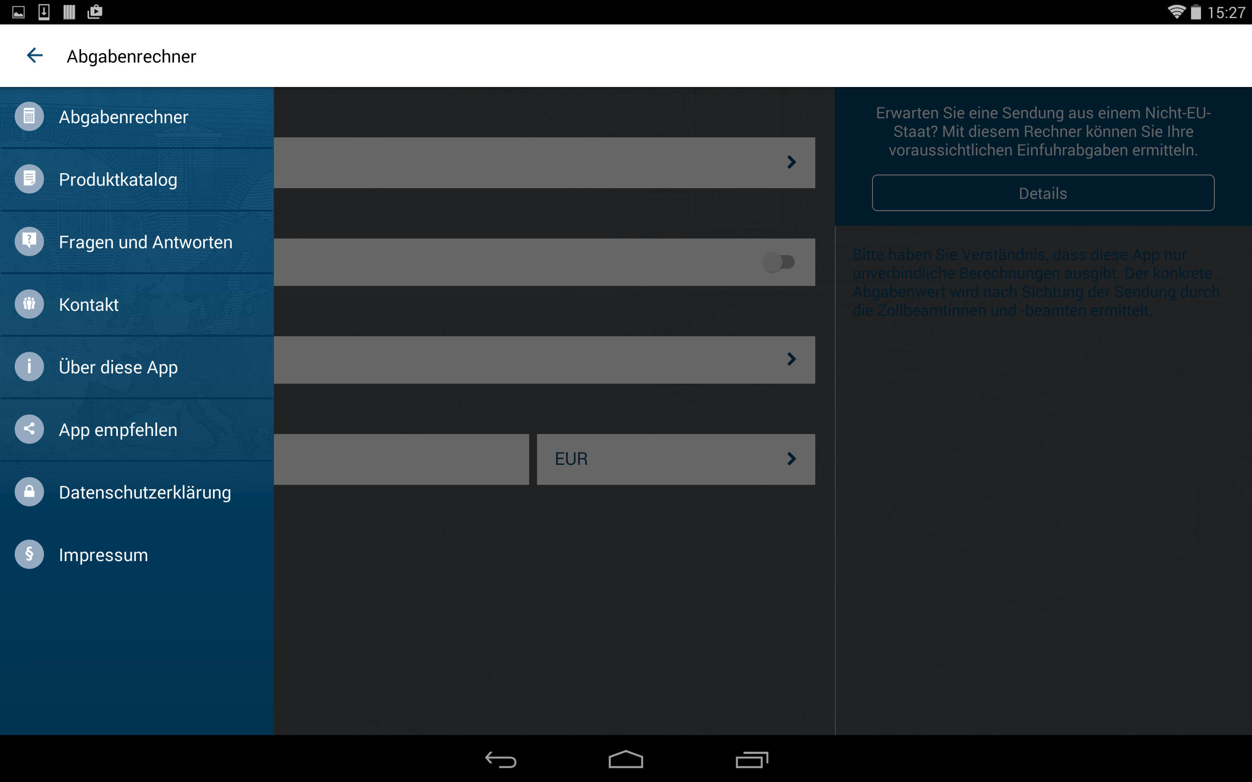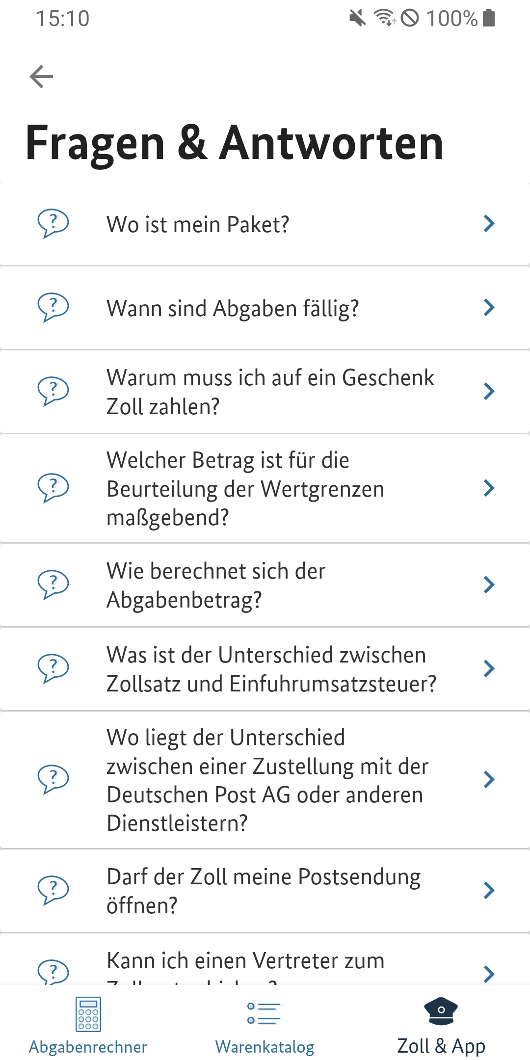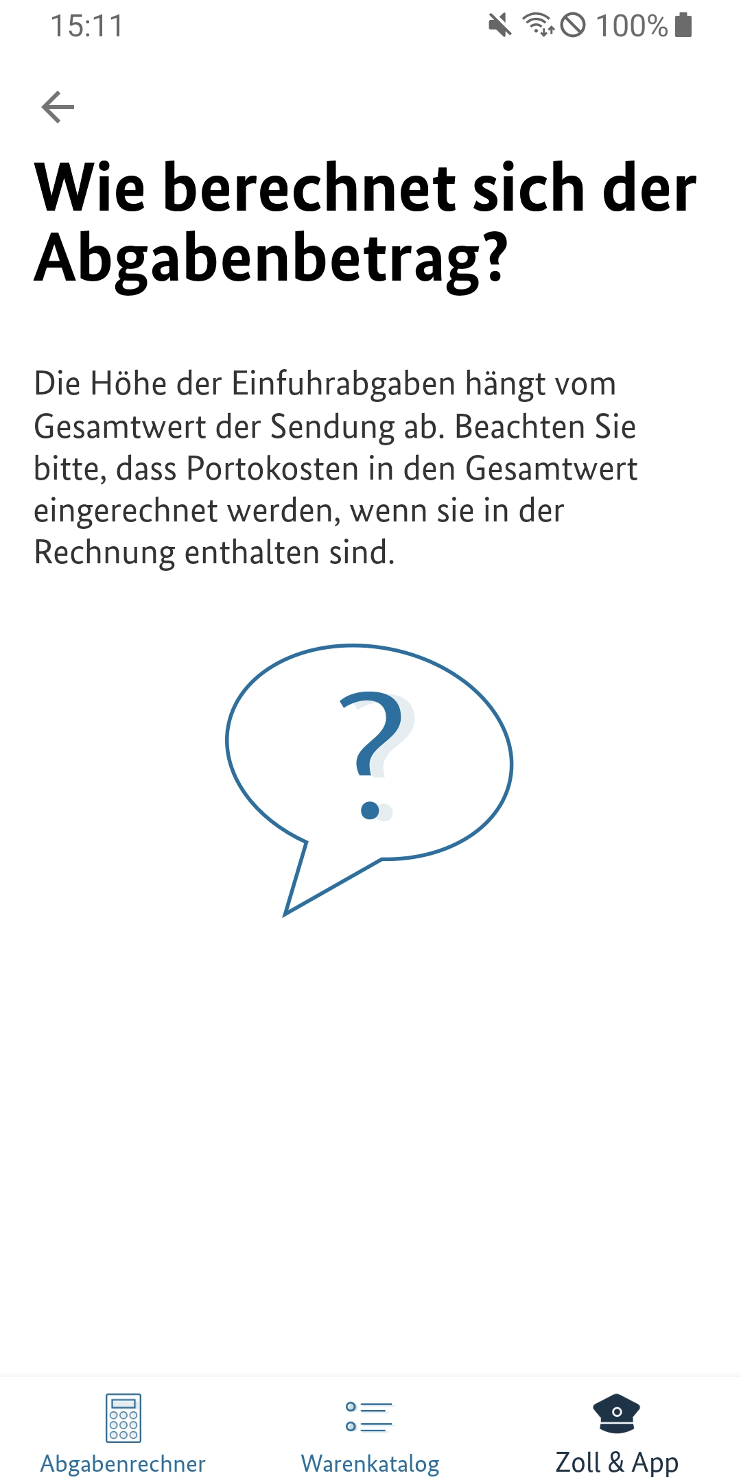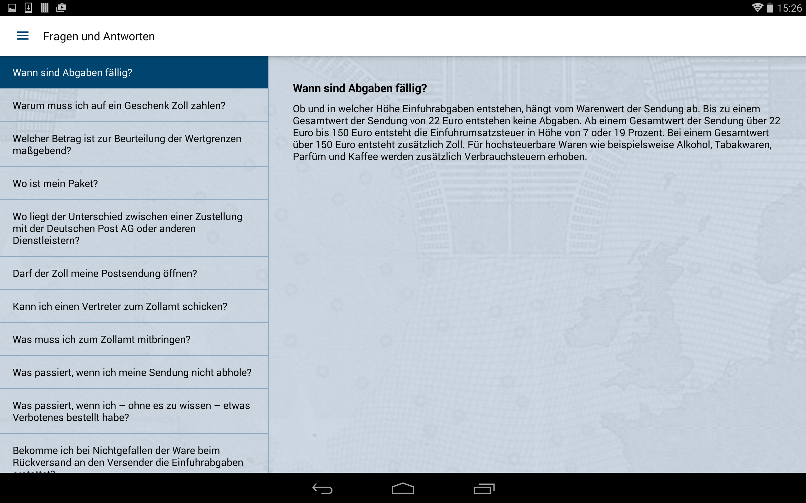 Einige Klicks und schon ist das gewünschte Paar Schuhe oder das neue Handy über das Internet bestellt. Nicht immer ist bekannt: Kommt die Ware aus einem Nicht-EU-Land, werden in vielen Fällen Einfuhrabgaben fällig, die das ursprüngliche Schnäppchen zum teuren Einkauf machen können. Damit Sie auf Nummer sicher gehen können, ob sich der Einkauf lohnt, gibt diese App einen Überblick zur Berechnung und Erhebung dieser Abgaben und auf welche Bestimmungen Sie ergänzend achten sollten. Beispielsweise können gefälschte Waren gesundheitsgefährdend sein, kann ungeprüftes Spielzeug Kinder gefährden oder können nicht fachgerecht produzierte elektronische Geräte brandgefährlich sein. Eine Netzwerkverbindung ist nur für die Aktualisierung der Umrechnungskurse und ggf. zum Aufruf von Links aus der App notwendig. Der Betrieb der Anwendung ist auch ohne Netzverbindung möglich. So entstehen für Sie im Normalfall keine Roaming-Gebühren. Bitte haben Sie Verständnis, dass diese App nur unverbindliche Berechnungen ausgibt. Der konkrete Abgabenwert wird nach Sichtung der Sendung durch die Zollbeamtinnen und -beamten ermittelt. Informationen zum Datenschutz erhalten Sie vorab auf der Website des Bundesfinanzministeriums: www.bundesfinanzministerium.de/datenschutz-zoll-und-post-app