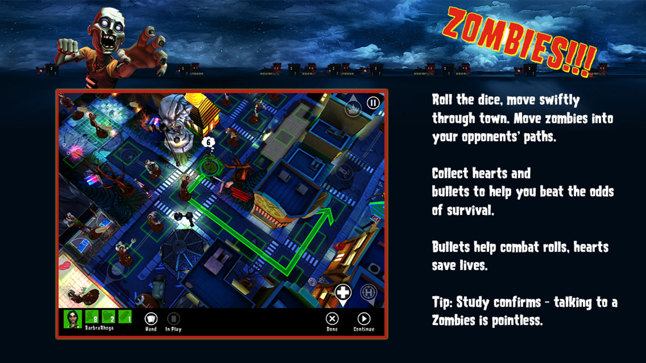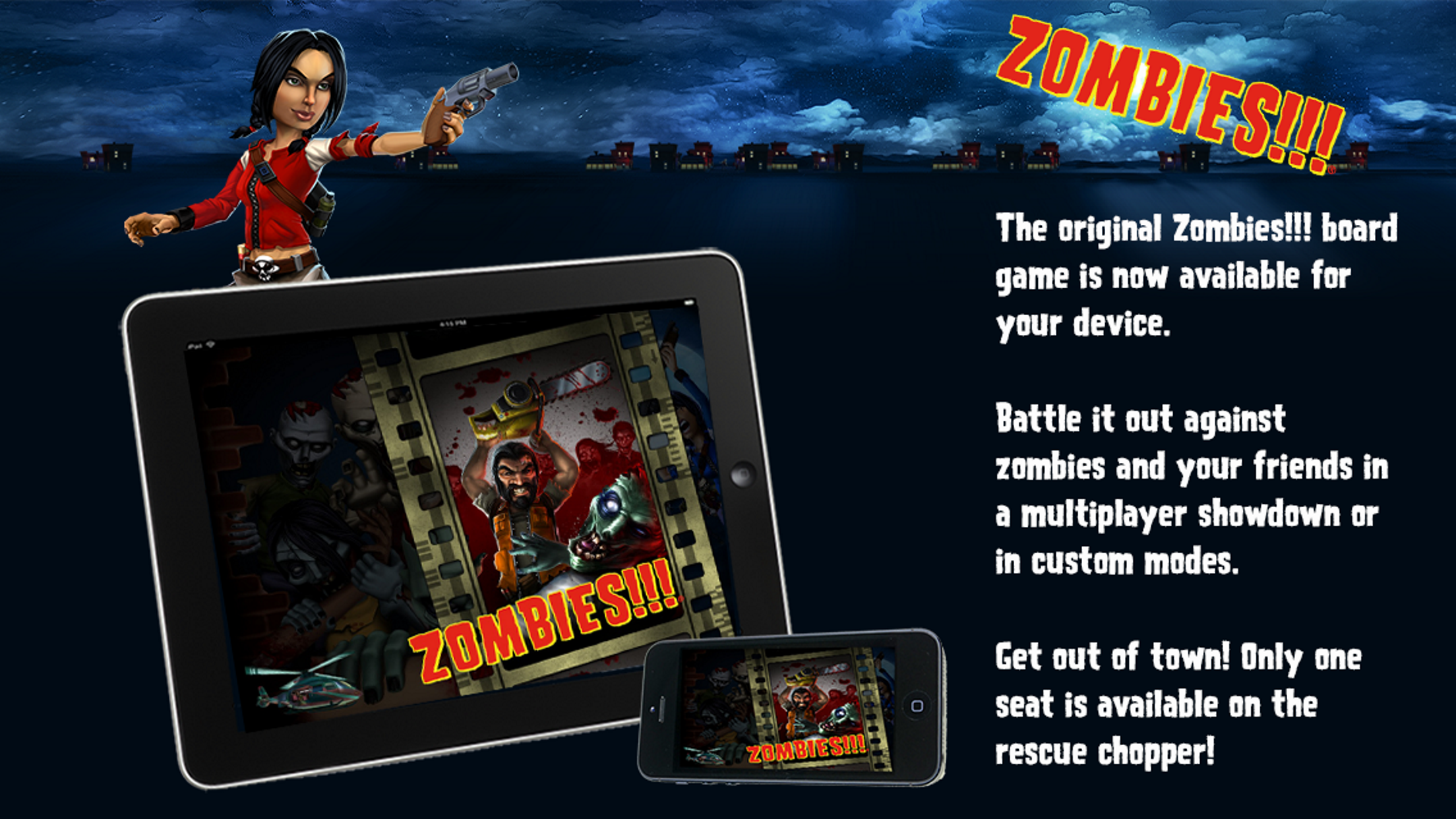 Zombies!!! : This one's a no-brainer! • Play up to 4 friends : local and cross-platform • Survival mode • Build a city or play in a prebuilt city • Expansion Pack : Not Dead Yet Zombies!!! puts you in the middle of the action in this video game adaptation of the hit board game. In order to escape the ever advancing zombie horde, players must use a combination of wits and brawn to be the first to the heliport and certain escape. The only problem is, the zombies are everywhere, they appear to be very hungry and your opponents would really prefer if you didn't escape. However, there’s no need to take this horde on your own. The game allows up to 4 other human or AI players to join in on the fun. AI players can be chosen from 10 different characters, each with a unique play style. Take on the Standard Game Mode, building your game board one tile at a time and killing zombies within the confines of the official Zombies!!! rules. Generated Town Mode drops the players into a premade town with Zombies in wait to make you their next meal. Survival Mode is the ultimate test: You versus a town full of zombies! How long can you last? If you have any questions, requests, ideas, or want to report bugs, please send us an email from ‘how to play’ menu. Or visit our support site at http://zombies.babaroga.com http://facebook.com/babarogagames. Twitter: @babarogatweet We care deeply about this game, and if there are any suggestions about how to make it better, we will do it in future updates. We care about you, the game and your experience