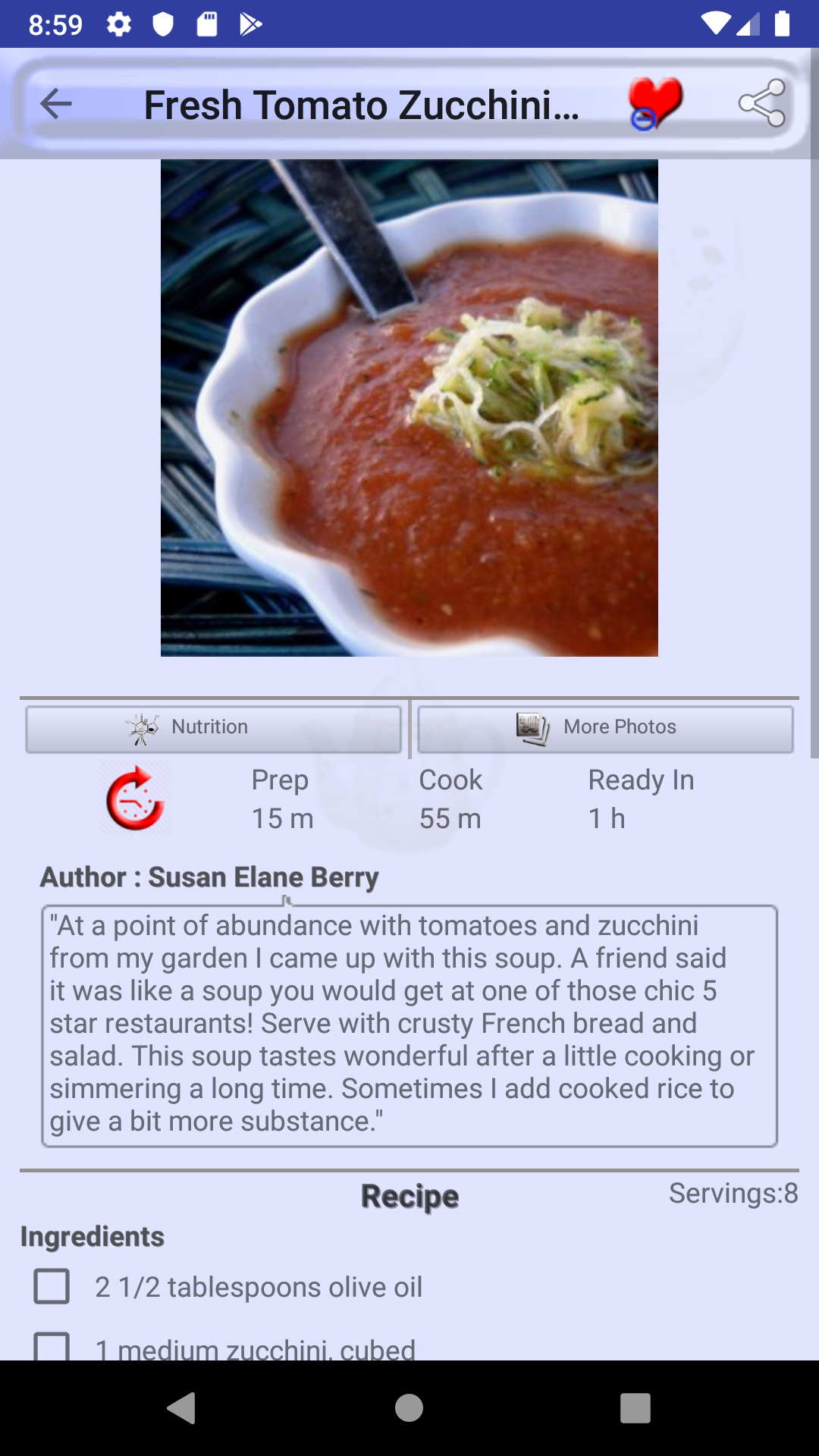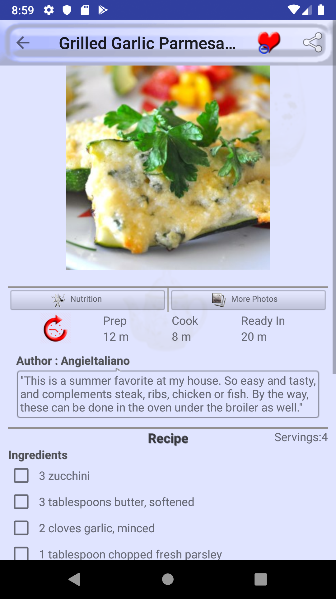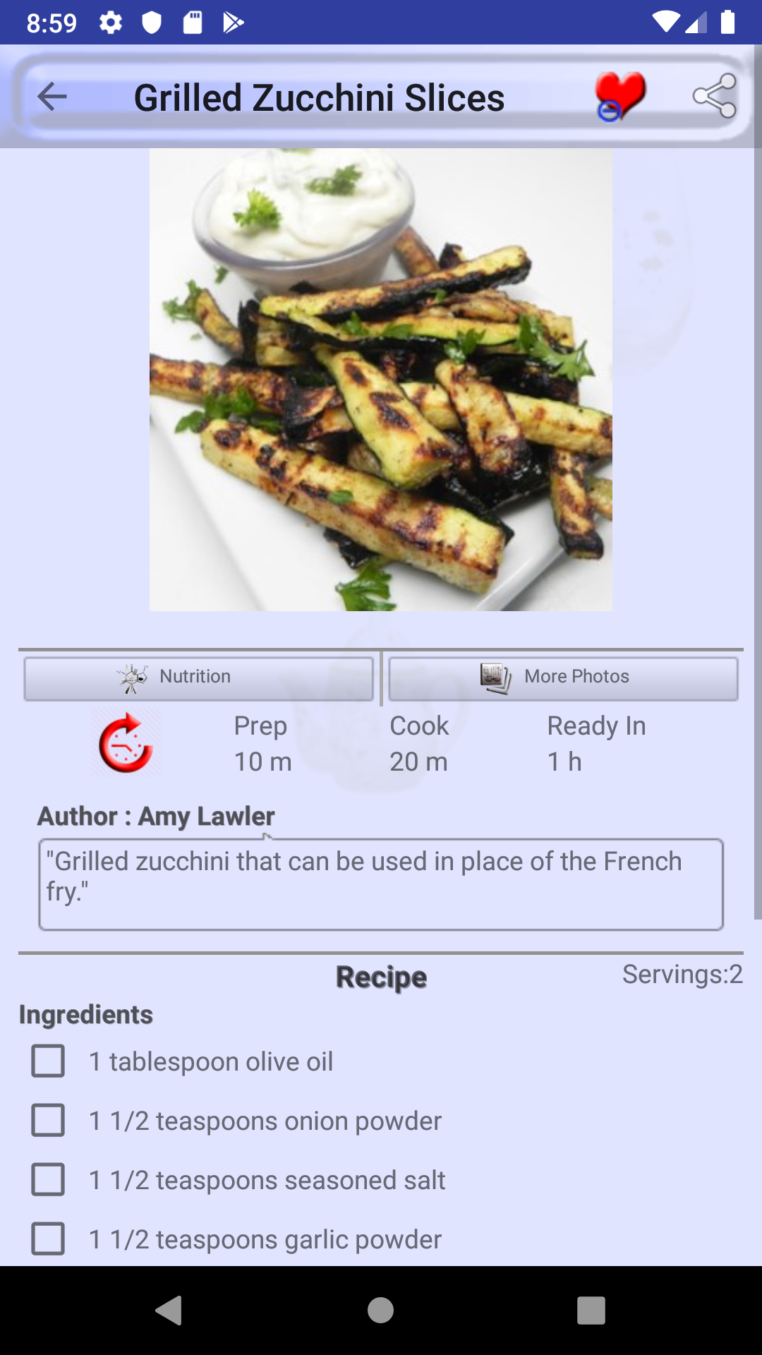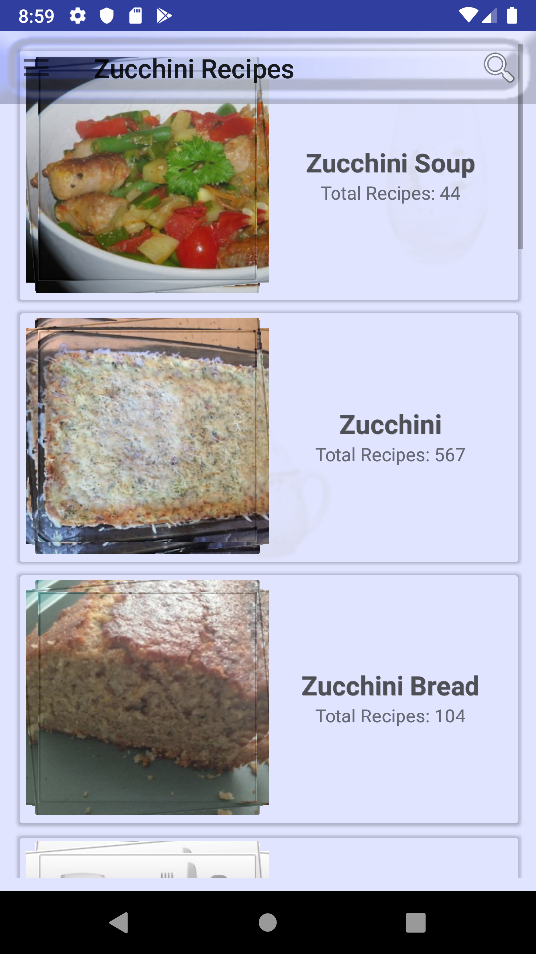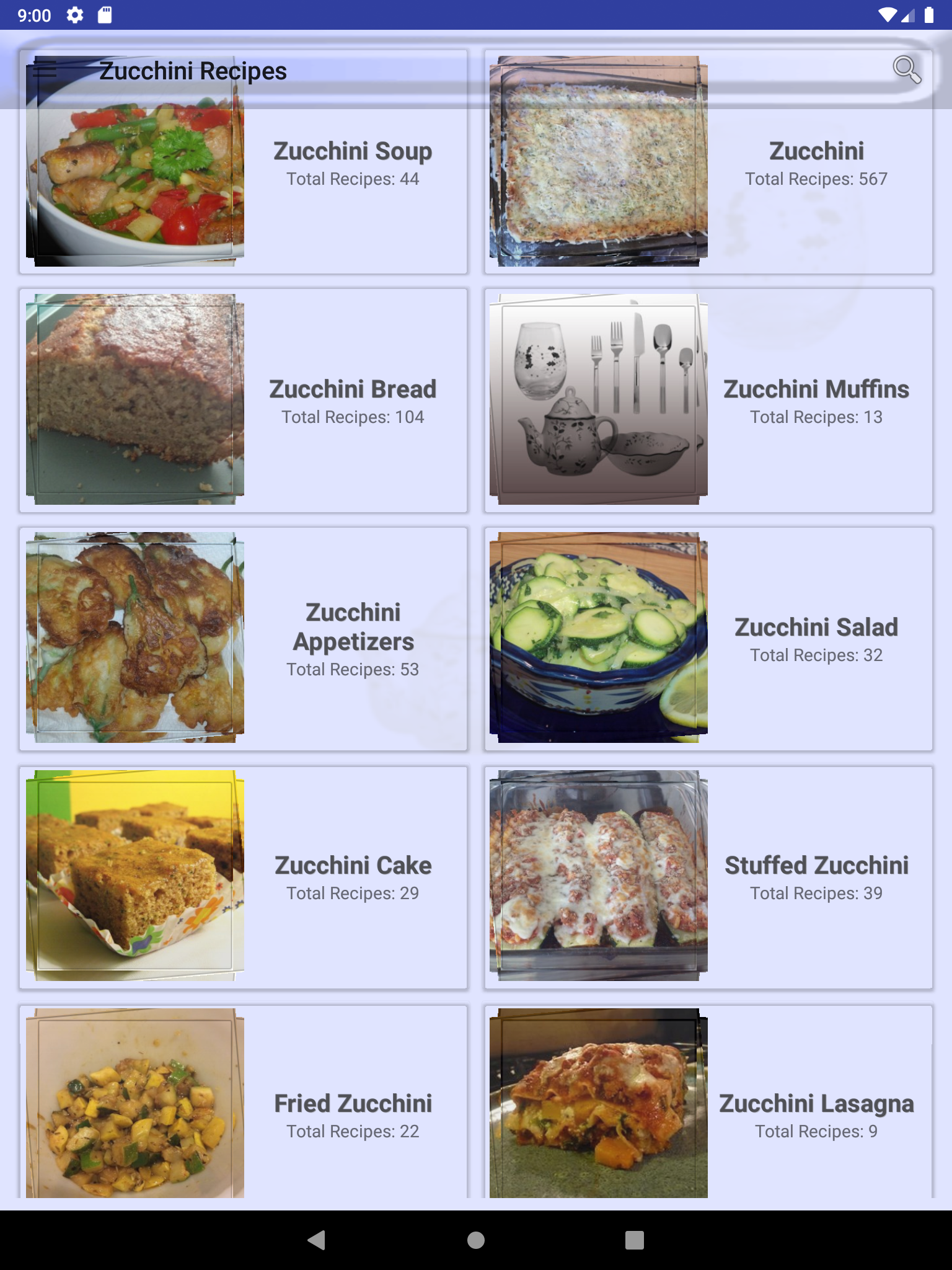 Zucchini Recipes is a free cookbook app with numerous healthy Zucchini recipes. All recipes in Zucchini Recipes can be made easily and quickly at home. So If you want to be a chef on your own try Zucchini Recipes and we assure you would not regret. Every TasteBuds recipe app is carefully crafted to include top rated cooking recipes and recipe collections that are both healthy and easy to prepare. Some of the recipe collections in Zucchini Recipes are: Zucchini Soup Zucchini Zucchini Bread Zucchini Muffins Zucchini Appetizers Zucchini Salad Zucchini Cake Stuffed Zucchini Fried Zucchini Zucchini Lasagna Zucchini Cookies Grilled Zucchini Zucchini Quiche and many more. Zucchini Recipes comes built-in with rich features such as: • SEARCH: Search recipe by name or by recipe collection • SHOPPING LIST: Our Zucchini Recipes app provides features to manage your shopping list of ingredients. Each ingredient is bound to its own recipe. you can mark an ingredient as purchased (strike-through) or completely delete from your recipe shopping list. • FAVORITES: Mark a recipe as favorite recipe and you will not need to search it again in thousands of recipes we provide in Zucchini Recipes. All favorite recipes have a dedicated favorite recipes section in menu drawer. • NUTRITION INFORMATION: Almost every recipe in Zucchini Recipes comes built-in with nutrition information, so you don't need to worry about your nutrition plan for your favorite Zucchini recipe. • PHOTOS INFORMATION: If you want to see the recipe from different perspectives we got you covered with more photos. • RECIPE TIME: We provide cook time, preparation time, and ready time with servings for each recipe in Zucchini Recipes. • SHARE: Share your favorite recipes with anyone using any sharing apps you are using such as Facebook, WhatsApp, Email, etc. • DEVICES SUPPORT: Almost all android phones and tablets are supported with both portrait and landscape mode. So happy cooking with Zucchini Recipes!